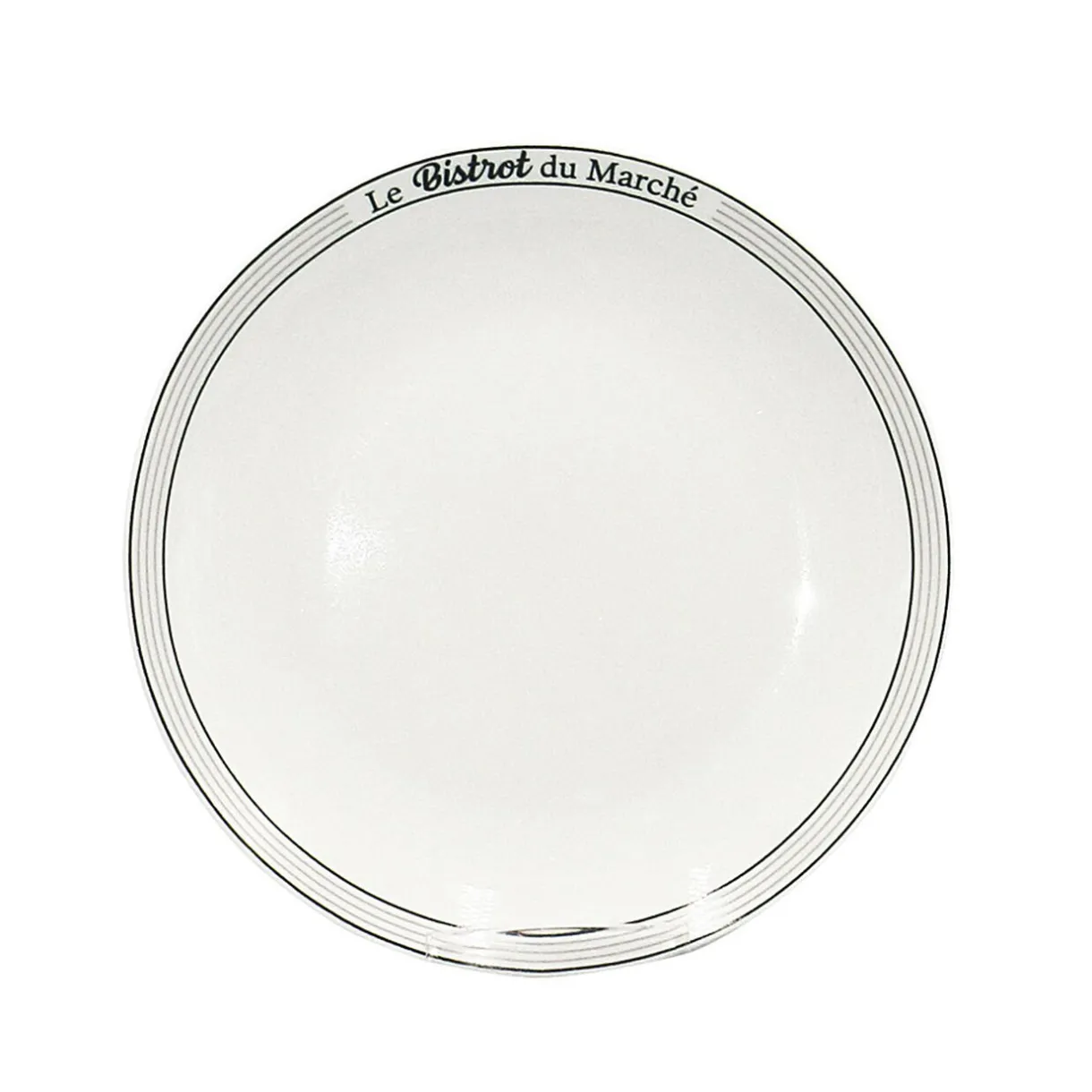 Assiette à dessert blanche avec liseré noir et inscription « Le petit bistrot » sur le contour.
