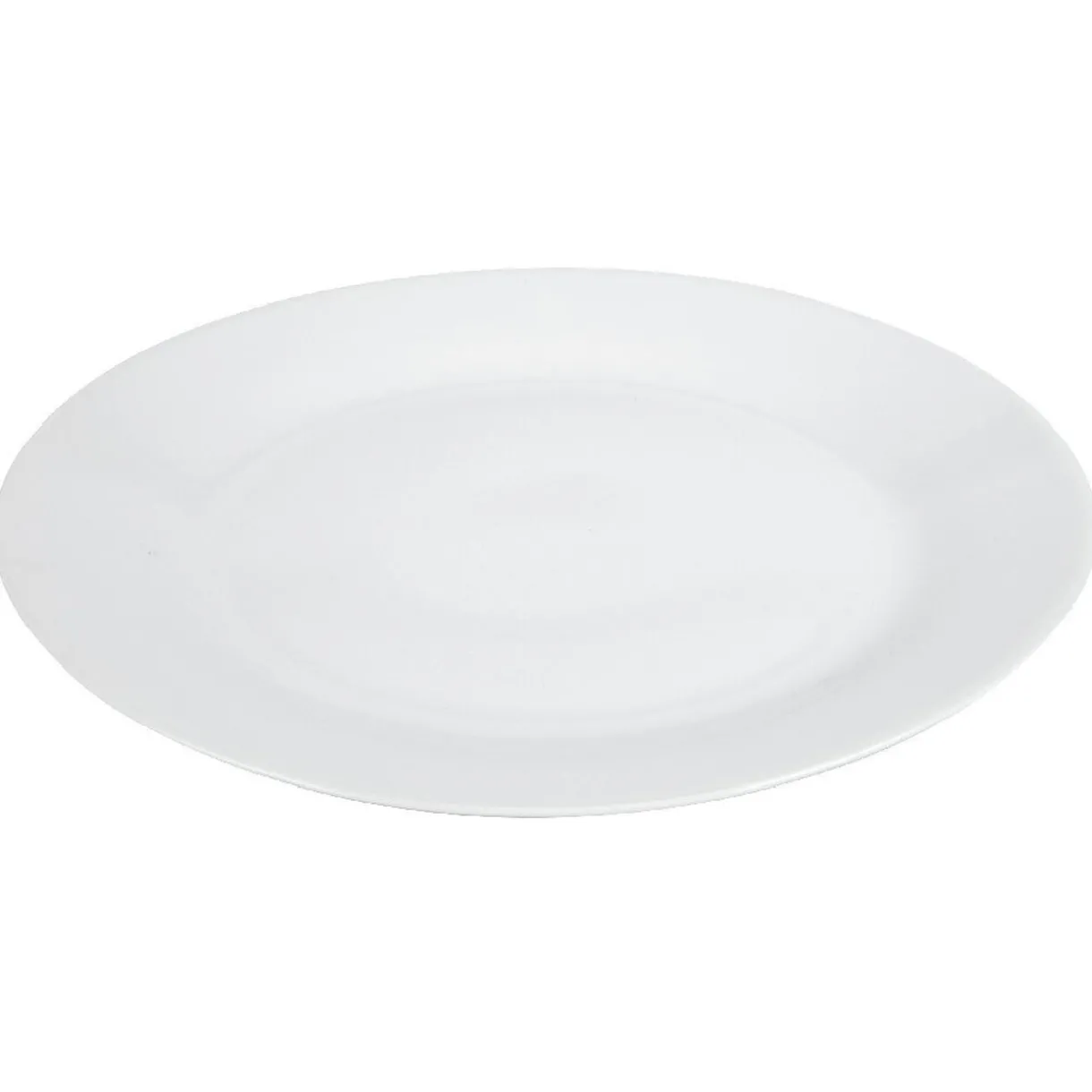 Assiette plate ronde en porcelaine, de couleur blanche.