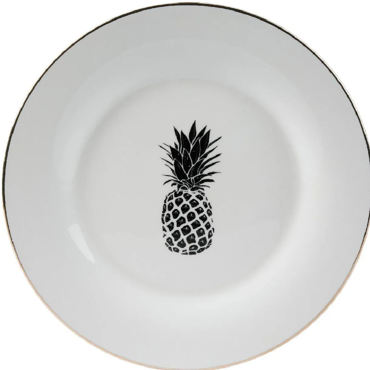 Jolie assiette plate ronde blanche en porcelaine style tropical avec motif ananas noir dans le fond. Découvrez sur notre site, l’assiette à dessert assortie !