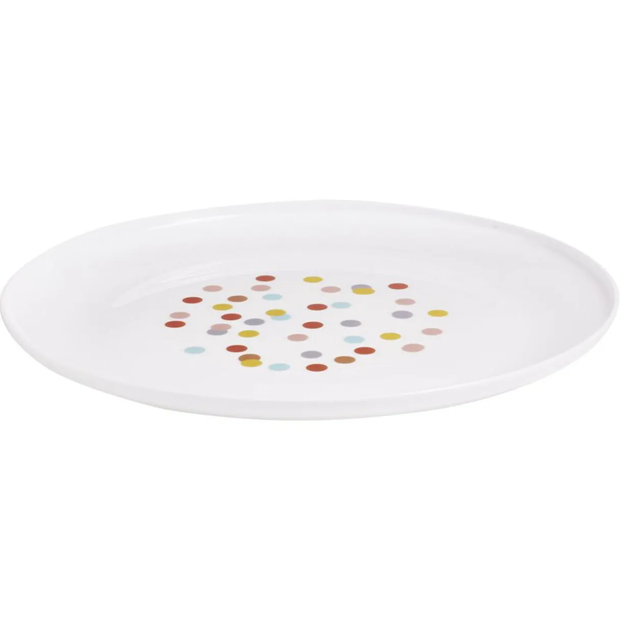 Assiette ronde en plastique imprimé pois multicolores.