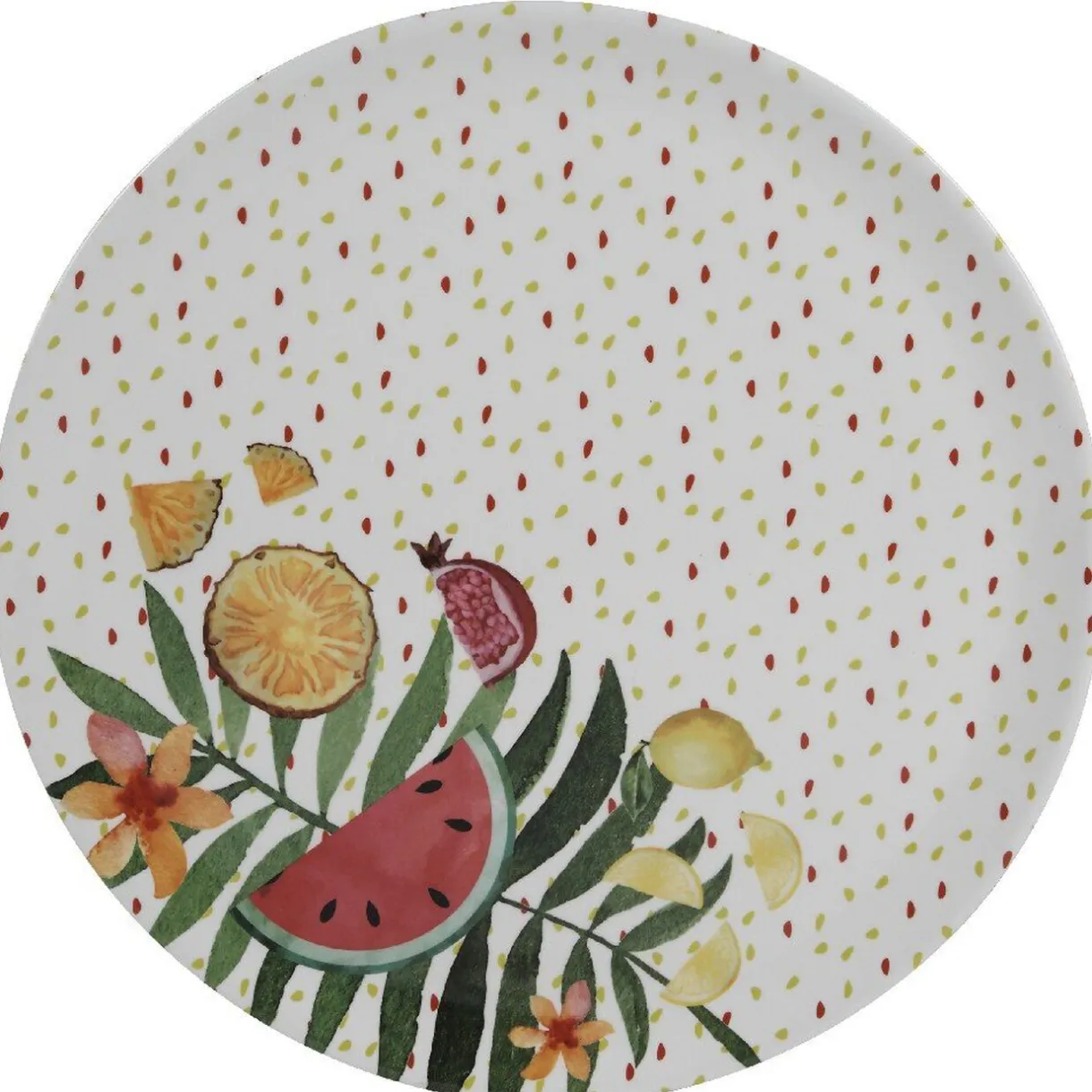Assiette ronde sur fond blanc imprimée de feuille de palmier et fruits exotiques multicolores.