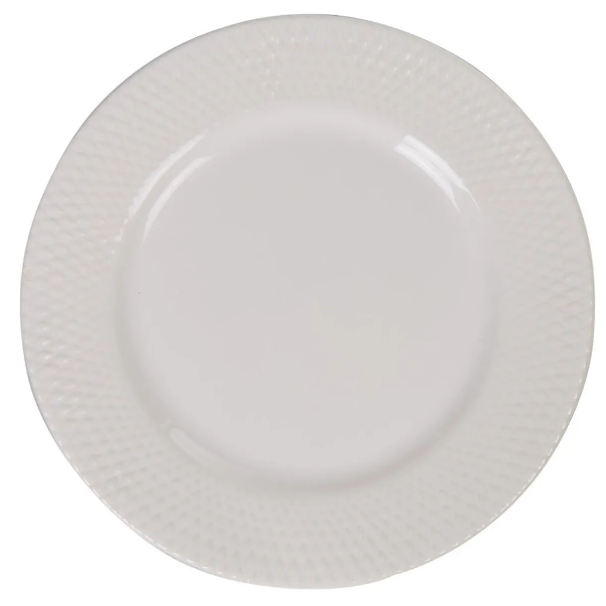 Assiette plate en céramique blanche avec rebord embossé. On aime ce design en relief à la fois simple et original qui conviendra à toutes les décorations de table.