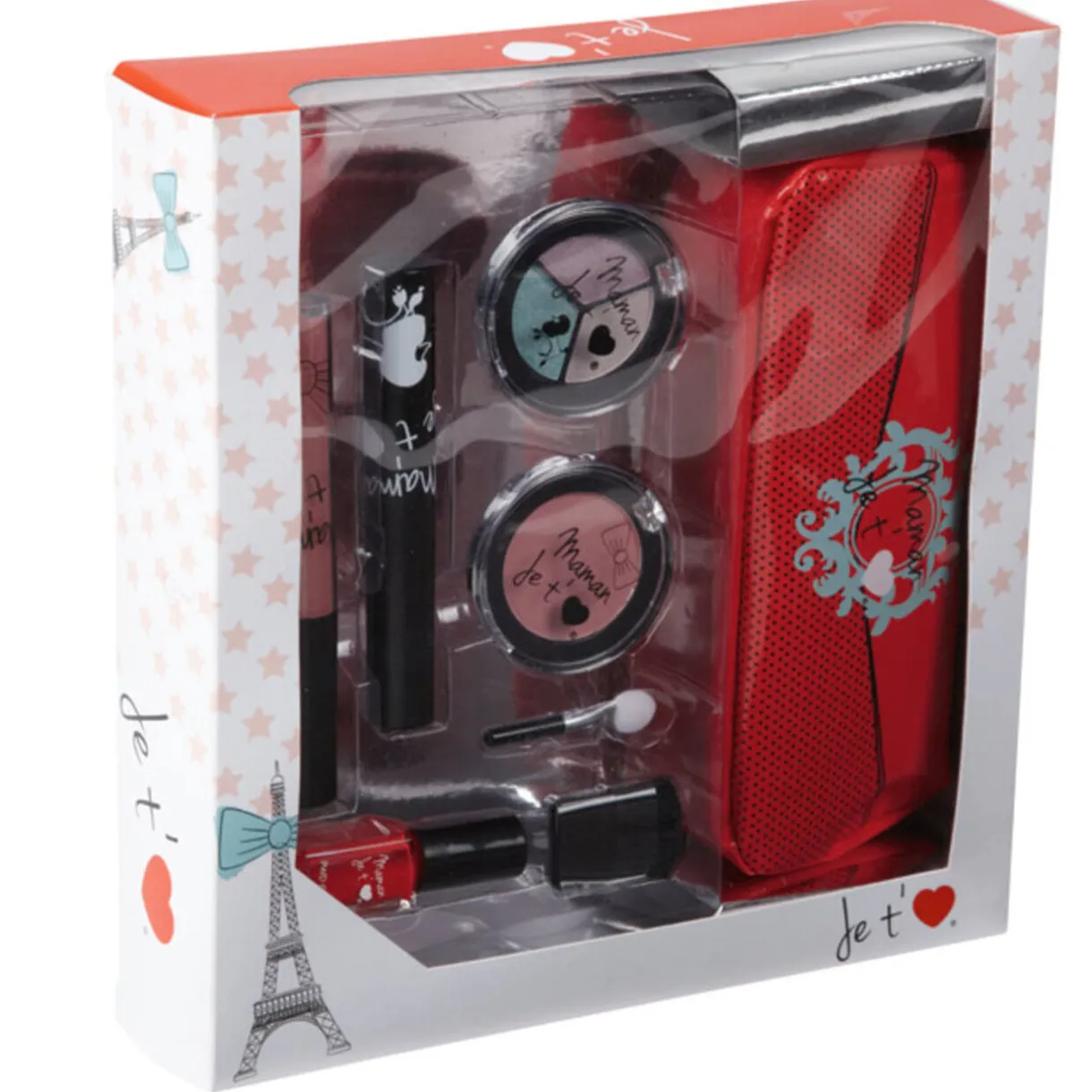 Coffret maquillage « Maman Je T’aime » comprenant : 1 trousse, 1 pinceau, 1 applicateur mousse, 1 vernis à ongles, 1 trio de fars à paupières, 1 fard à joue, 1 brillant à lèvres et 1 mascara. Paris Wear Diffusion © Marque et modèle déposés.