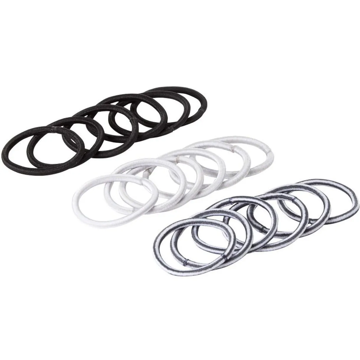 Lot de 18 élastiques, sans métal, en polyester uni noir, gris et blanc.