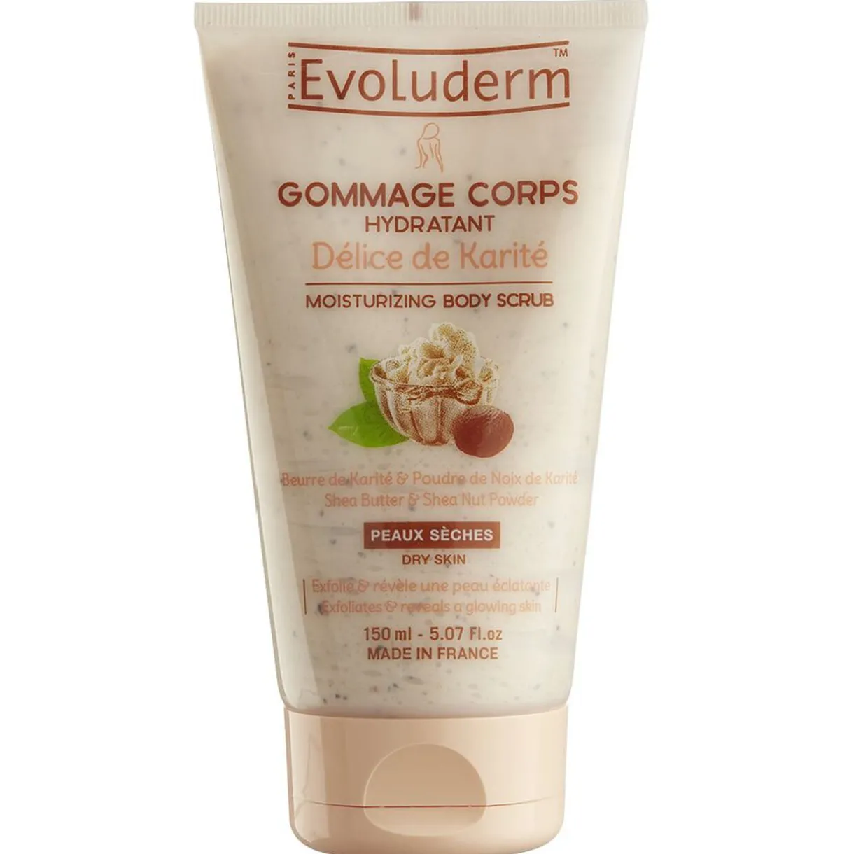 Gommage pour le corps Evoluderm enrichi en beurre de karité et poudre de noix de karité. Exfolie avec délicatesse pour une peau souple et éclatante.
