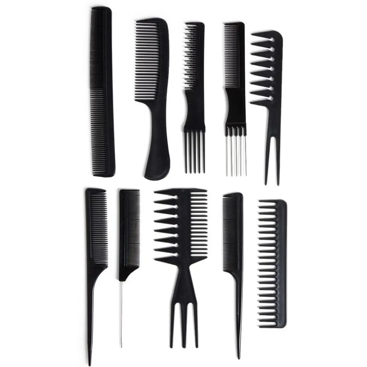 Cet ensemble comprend 10 peignes en plastique de formes variées, offrant une solution polyvalente pour tous les types de cheveux.