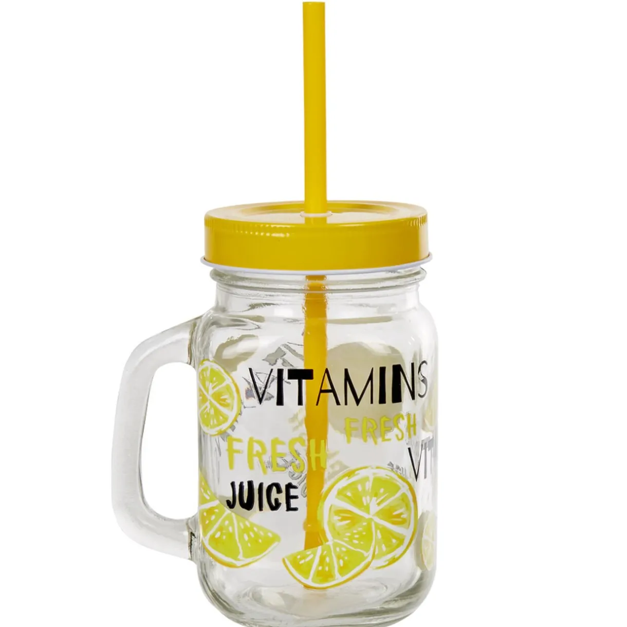 Tasse à anse en verre transparente avec décor citron, couvercle et paille jaunes.