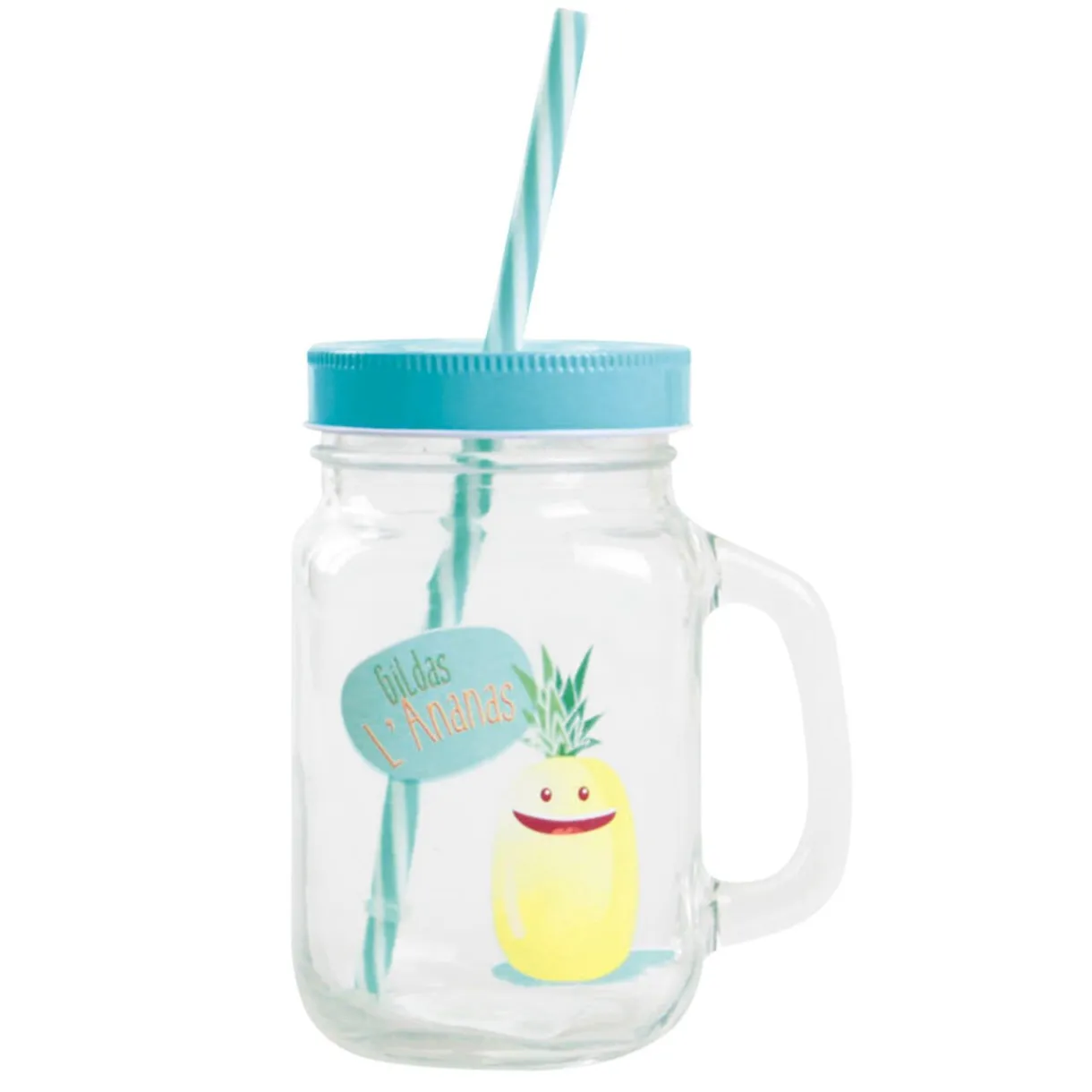 Bocal à anse transparent motif et inscription « Gildas L’Ananas » avec paille et couvercle bleus et blancs. Idéal pour se détendre tout en savourant sa boisson !