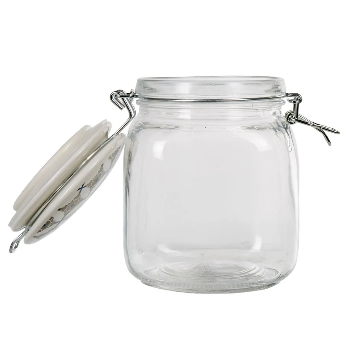 Bocal en verre avec fermeture hermétique, de forme carré avec ses motifs carreaux de ciment sur le couvercle, pour une contenance de 1 litre.Idéal pour faire vos conserves en bocaux, vous trouverez le même modèle en d’autres formats !