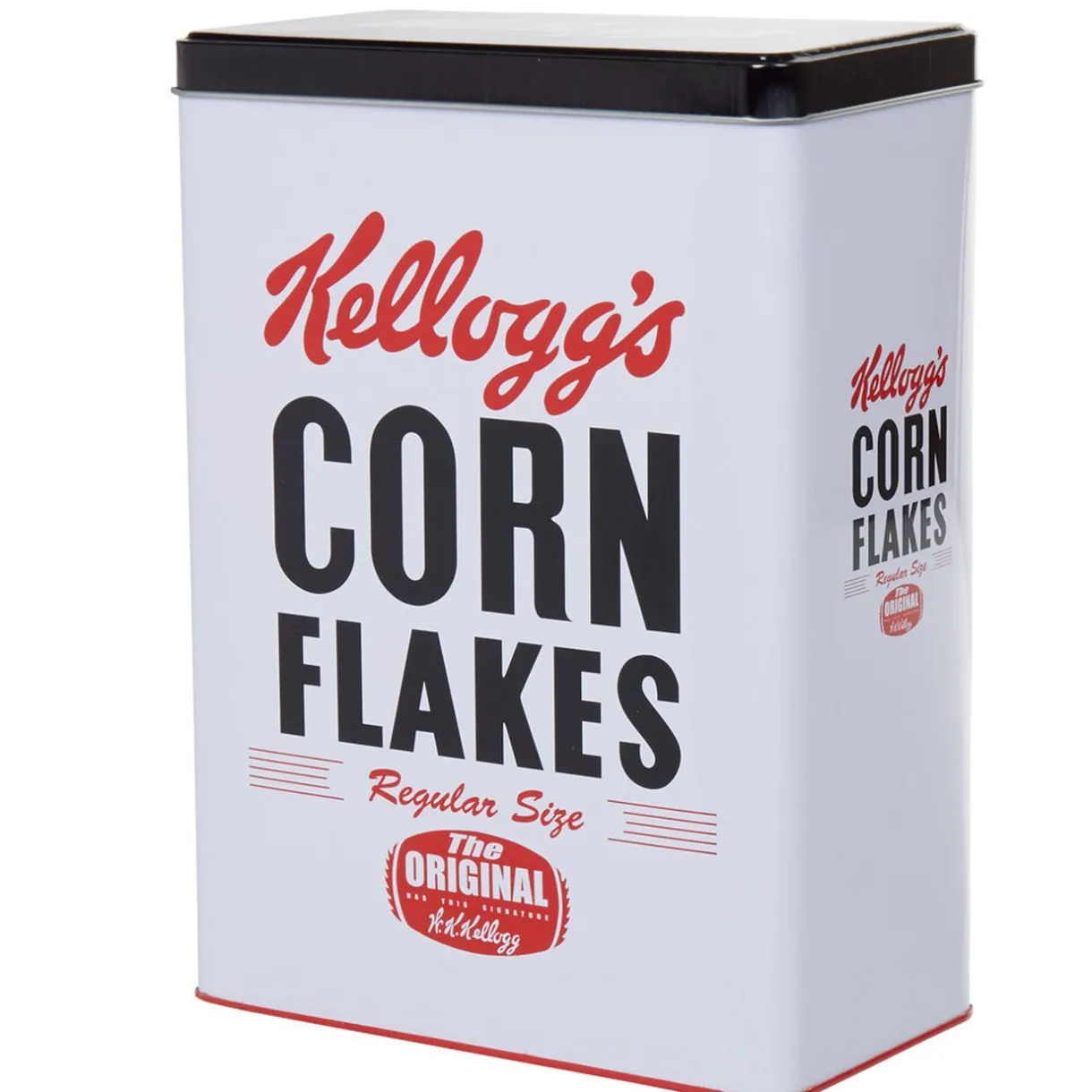 Boîte en métal Kellogg’s Corn flakes de couleur noir, blanc et rouge.