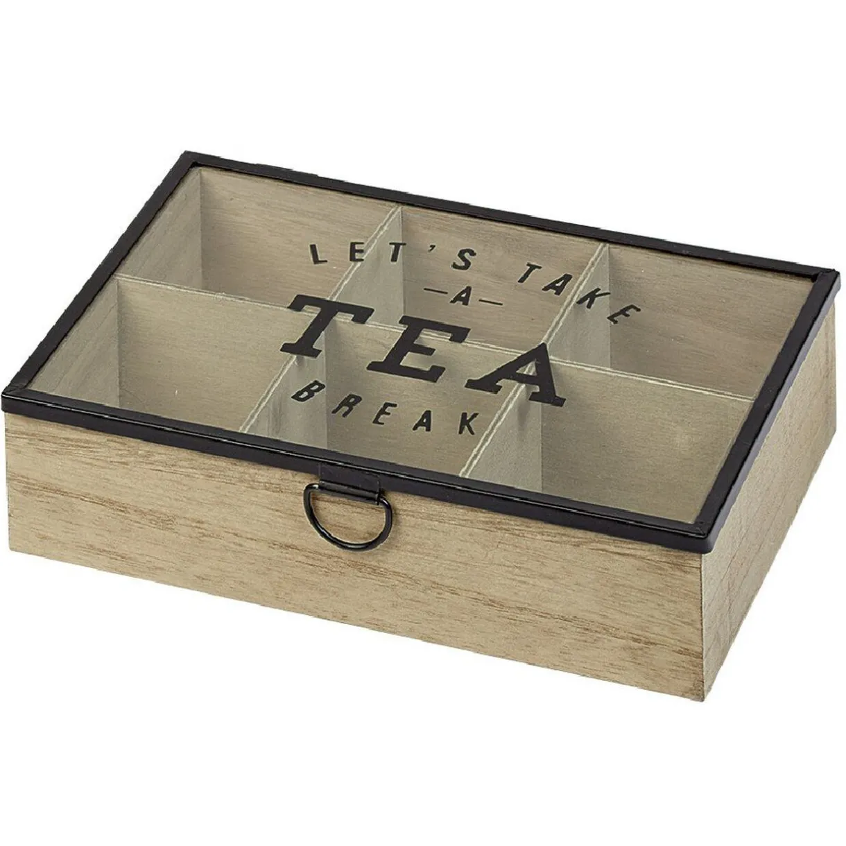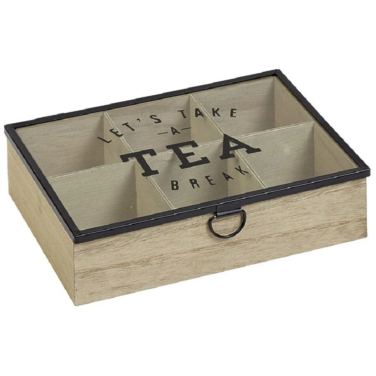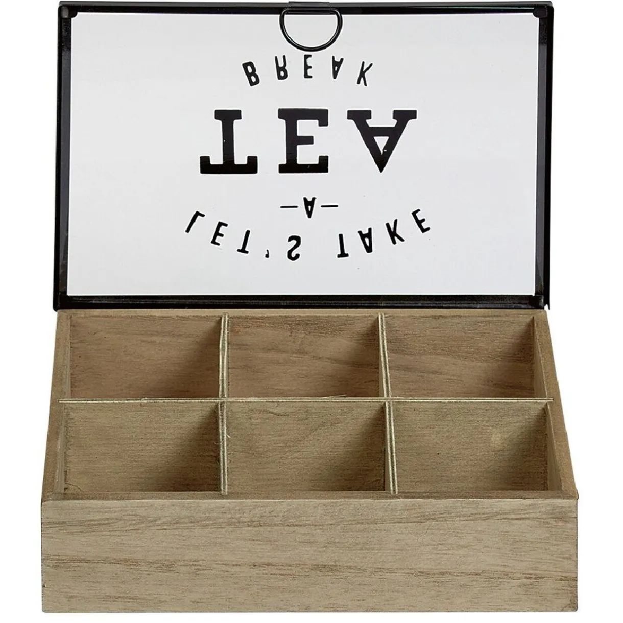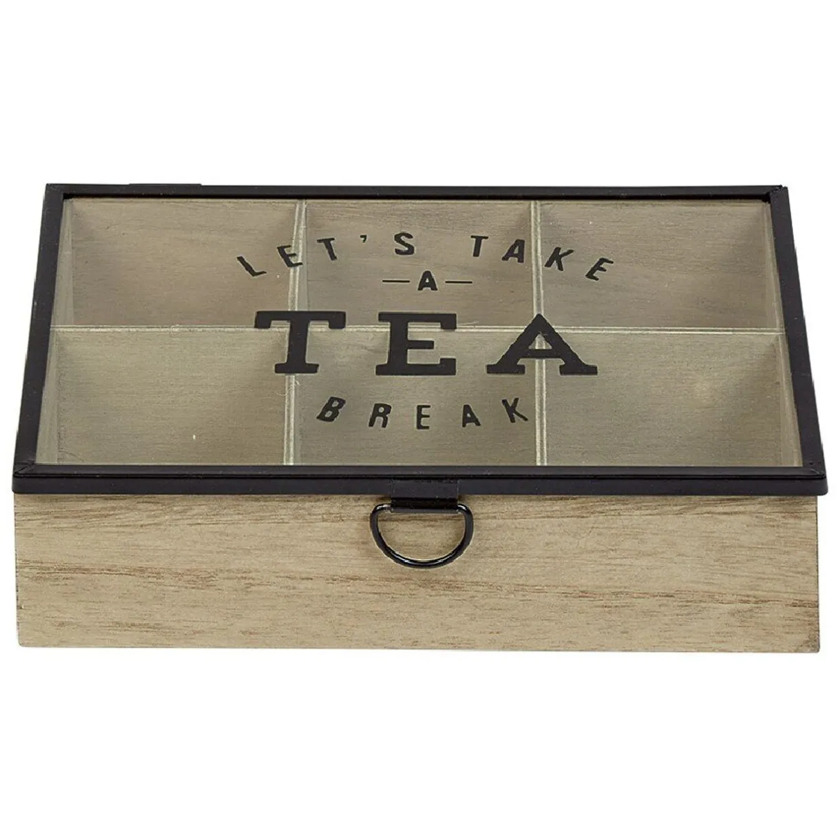 Composé de bois au coloris naturel et de fer noir, la boîte comprend un couvercle en verre décoré de l’inscription « Let’s take a tea break ».