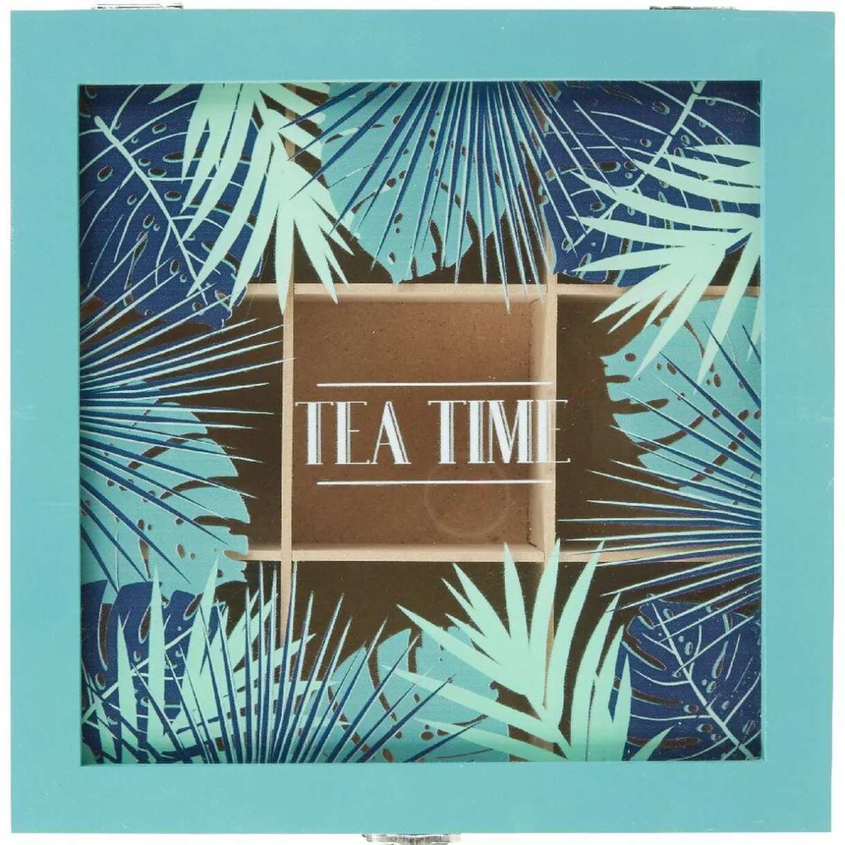 Boite à thé carrée en bois peint couleur vert d’eau et plateau de verre sur le dessus avec décor feuillage tropical et inscription « tea time ».