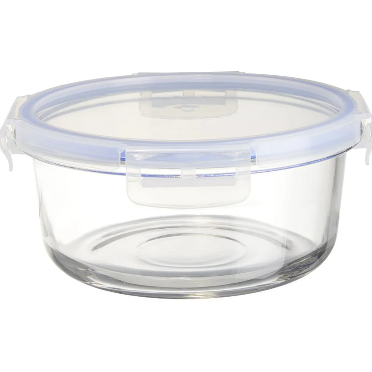 Boîte de conservation ronde en verre transparent avec couvercle à fermeture clips en plastique.