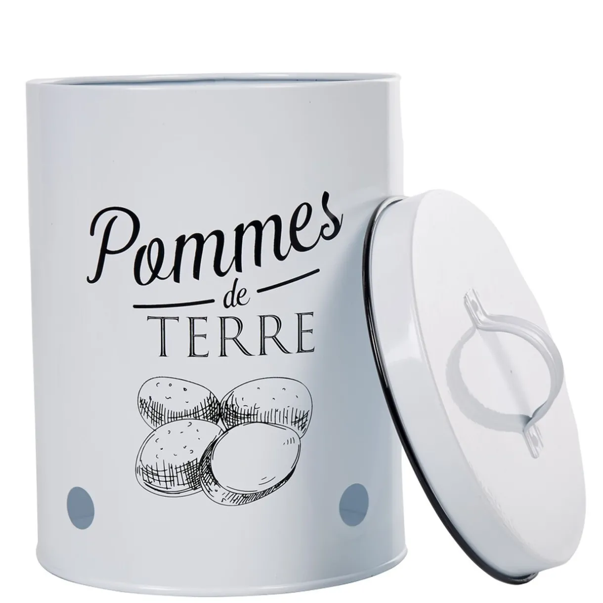 Boîte de conservation de style vintage en métal blanc avec inscription « pommes de terre » de couleur noire.