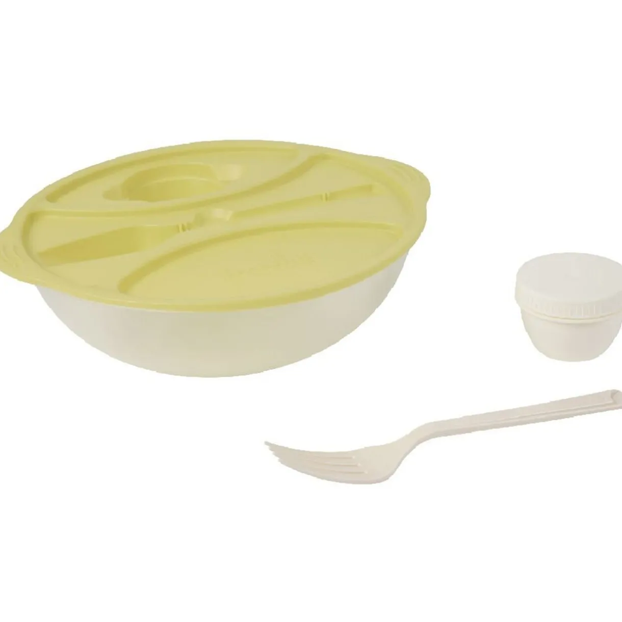 Lunch box avec couvercle bleu ou vert, ø 23 cm, plastique. Fourchette et pot plastique inclus. Diff. coloris, disponibilité selon arrivage. Boîte alimentaire idéale pour pique nique ou pose déjeuner.