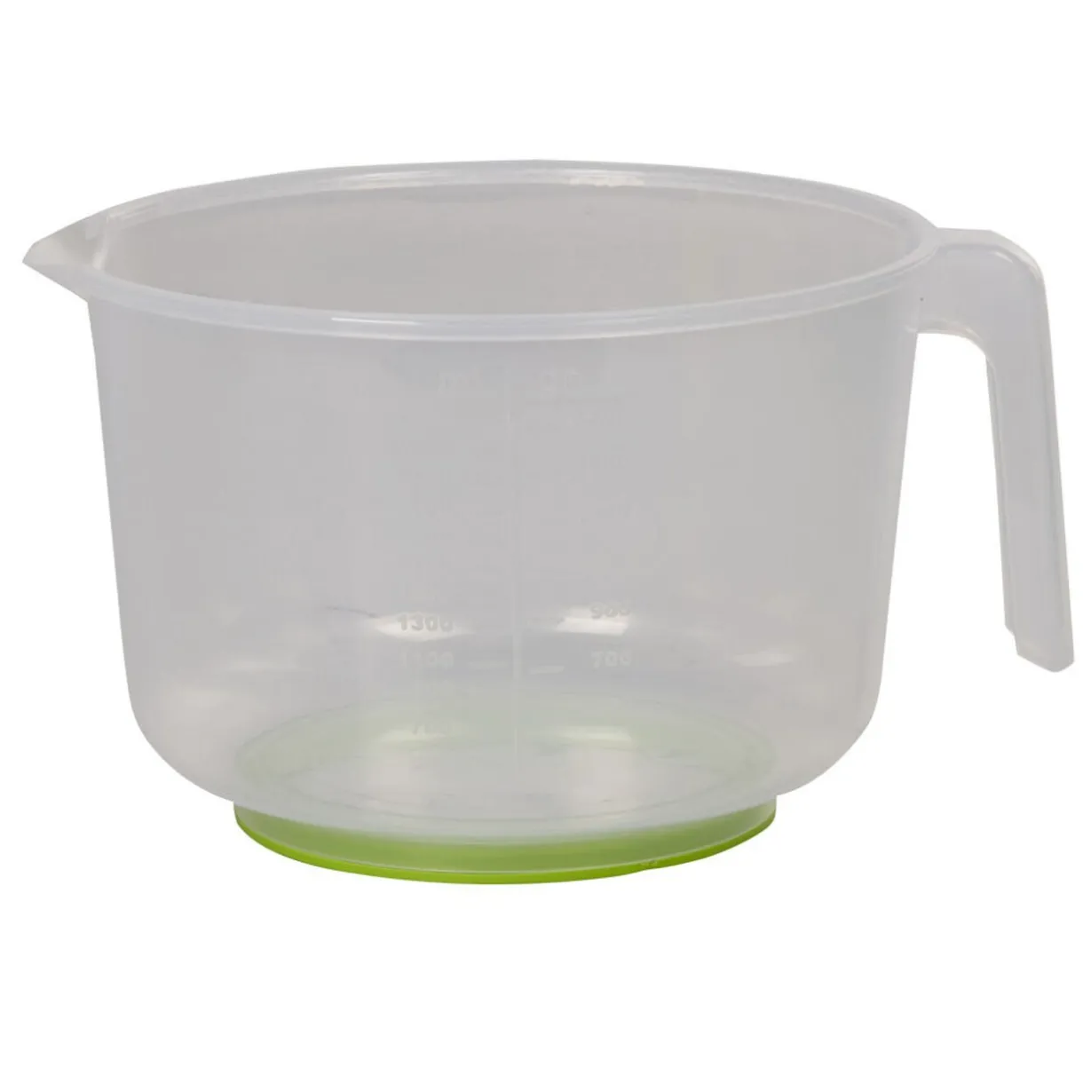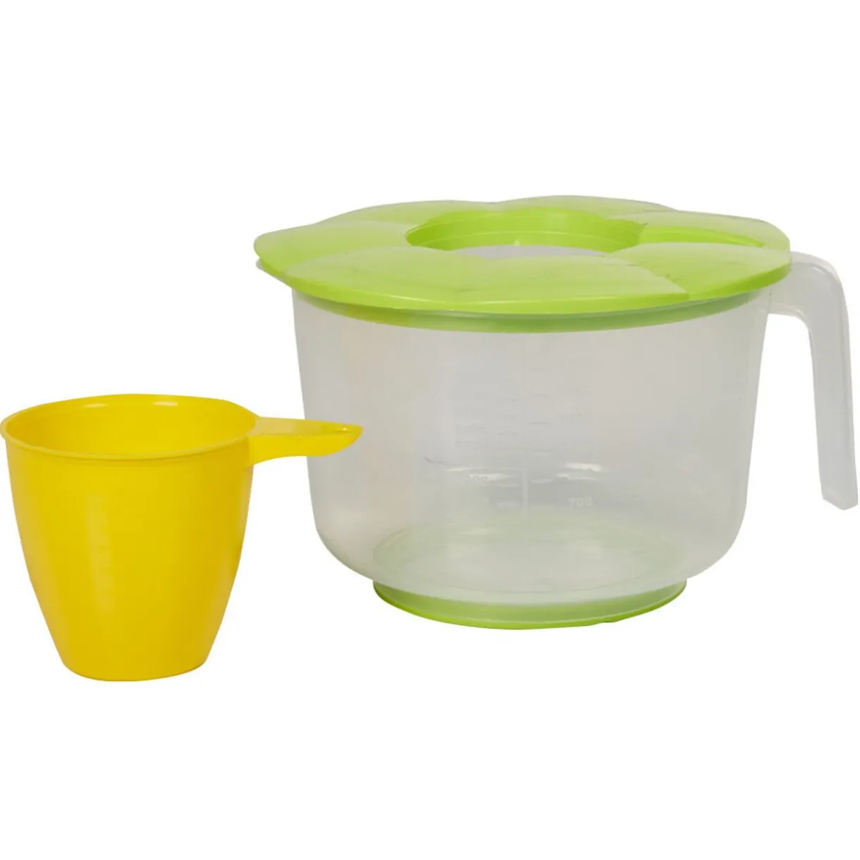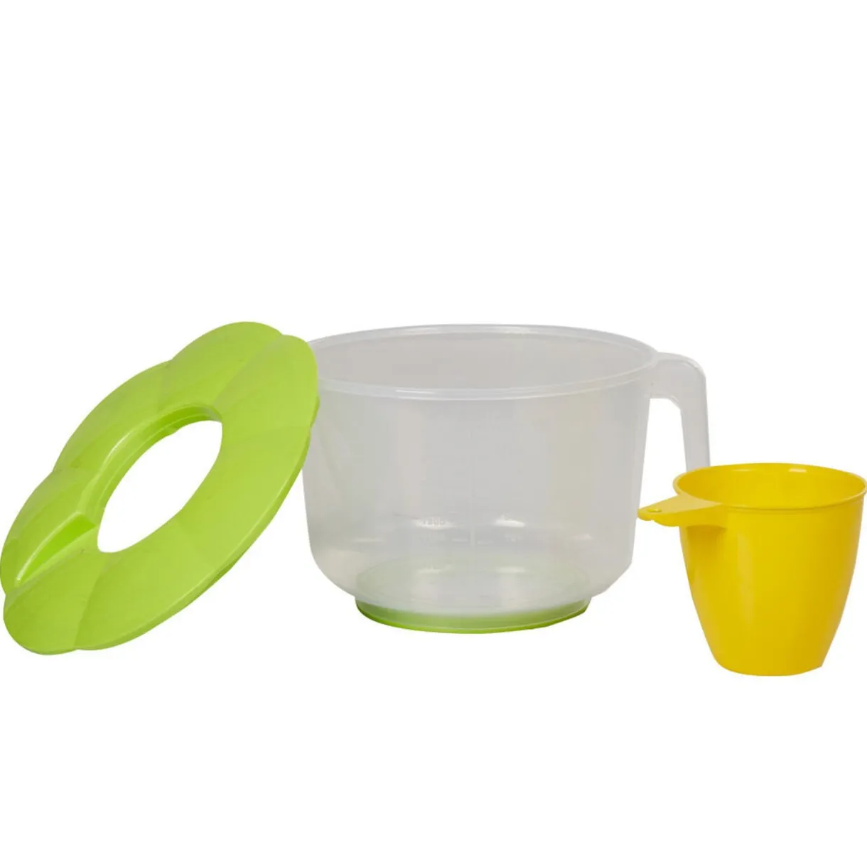 Bol doseur transparent avec couvercle et gobelet intégré jaune et vert.