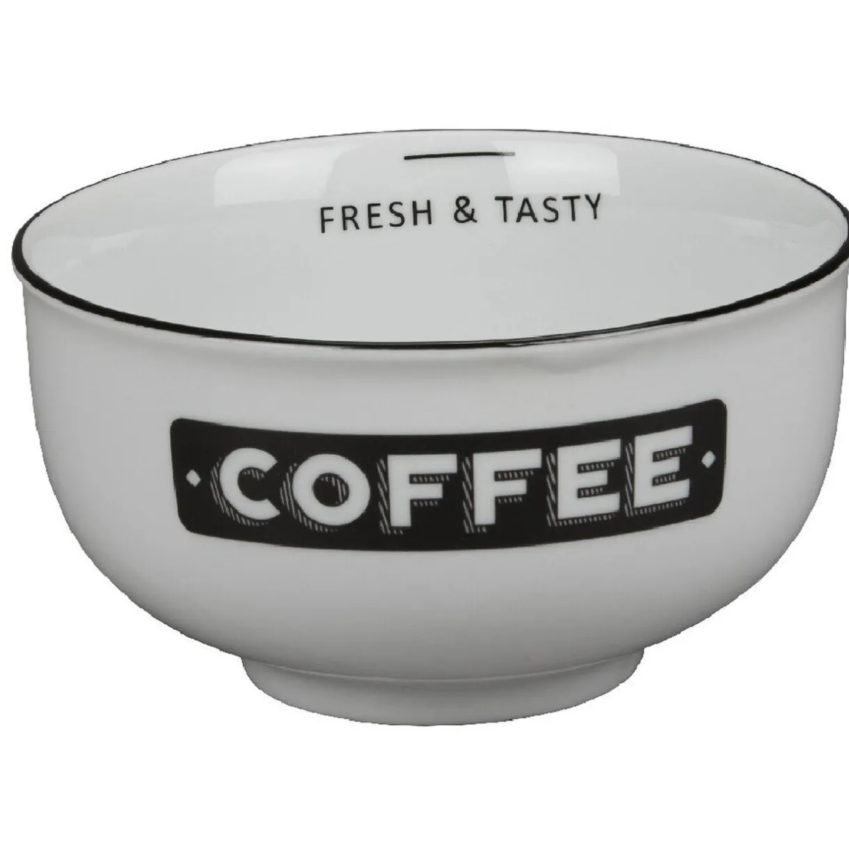 Commencez la journée du bon pied avec ce bol blanc décoré des inscriptions « coffee » (café) et « fresh & tasty » (frais et savoureux).