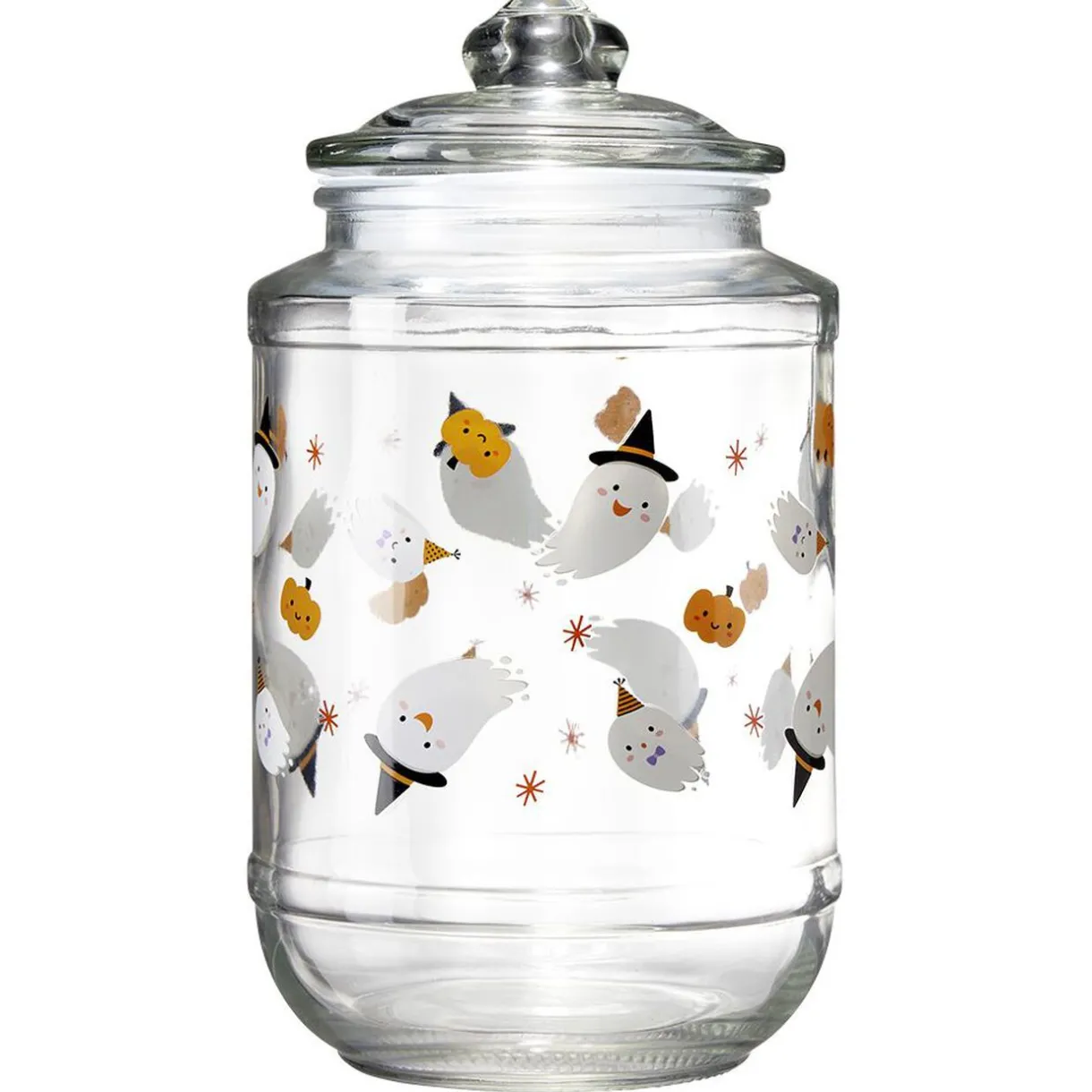 Bonbonnière en verre avec motifs fantôme-sorcières et citrouilles, idéale à l’occasion d’Halloween !