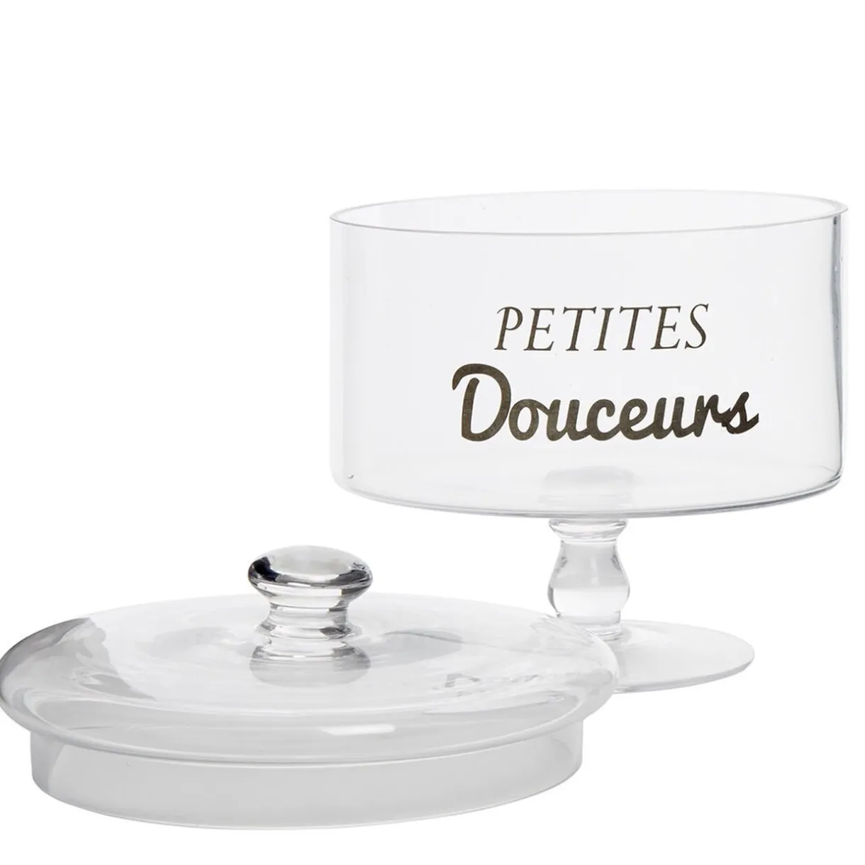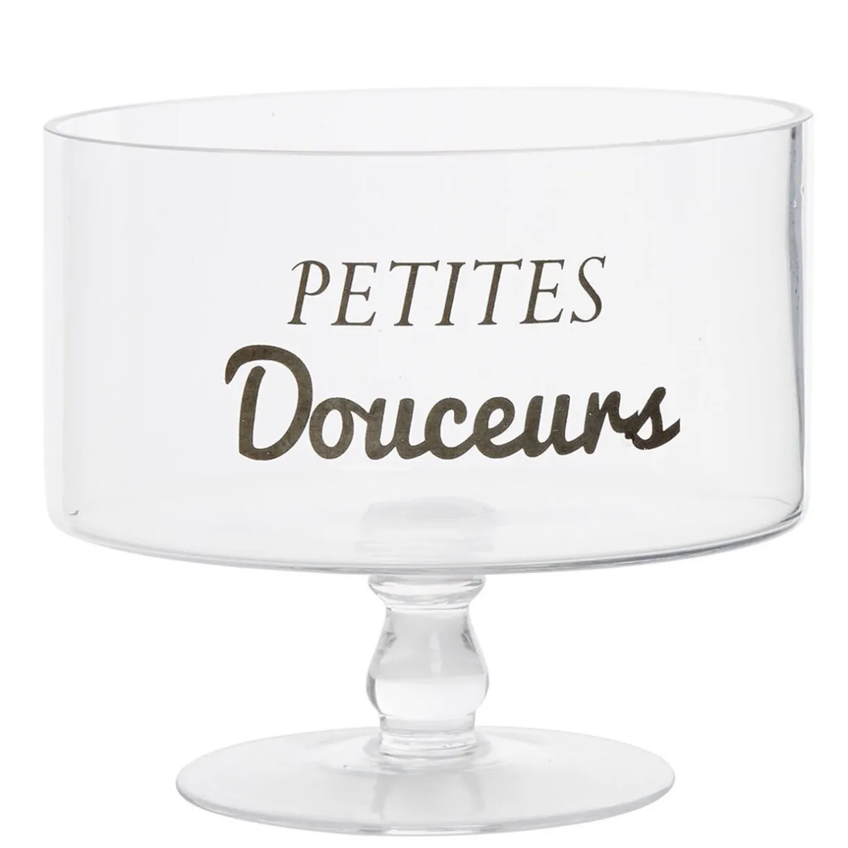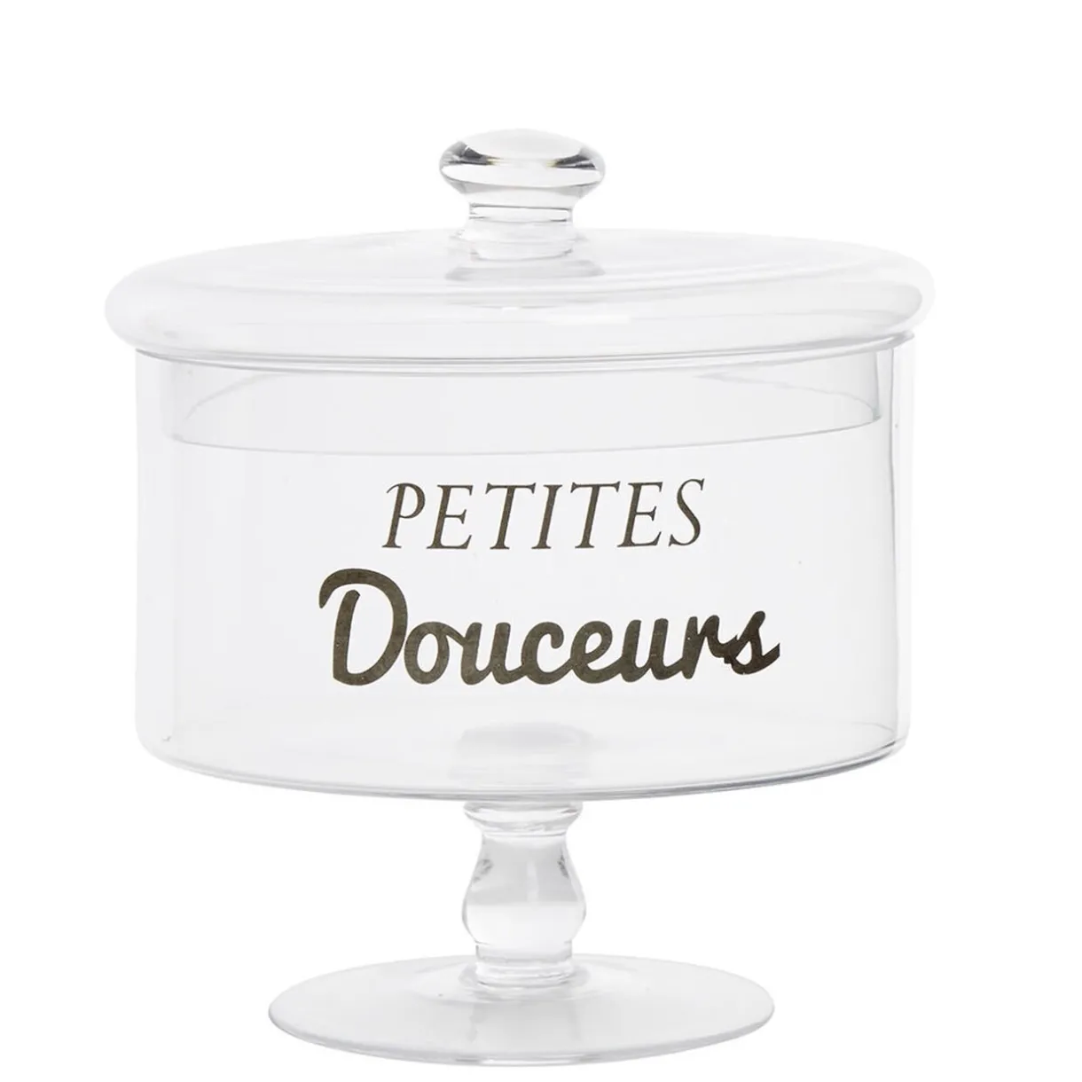 Bonbonnière transparente sur pied avec inscription noire Petites douceurs.