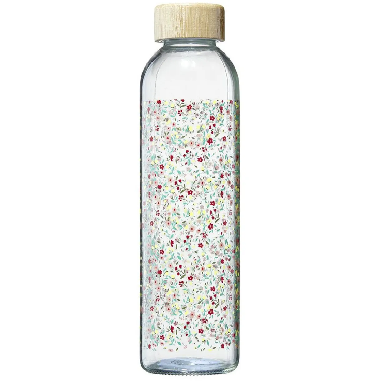 Bouteille en verre transparent à motif fleurs multicolores avec bouchon en bambou naturel. Esthétique et réutilisable à l’infini, cette bouteille sera parfaite sur la table ou pour le bureau pour se rafraîchir tout au long de la journée.
