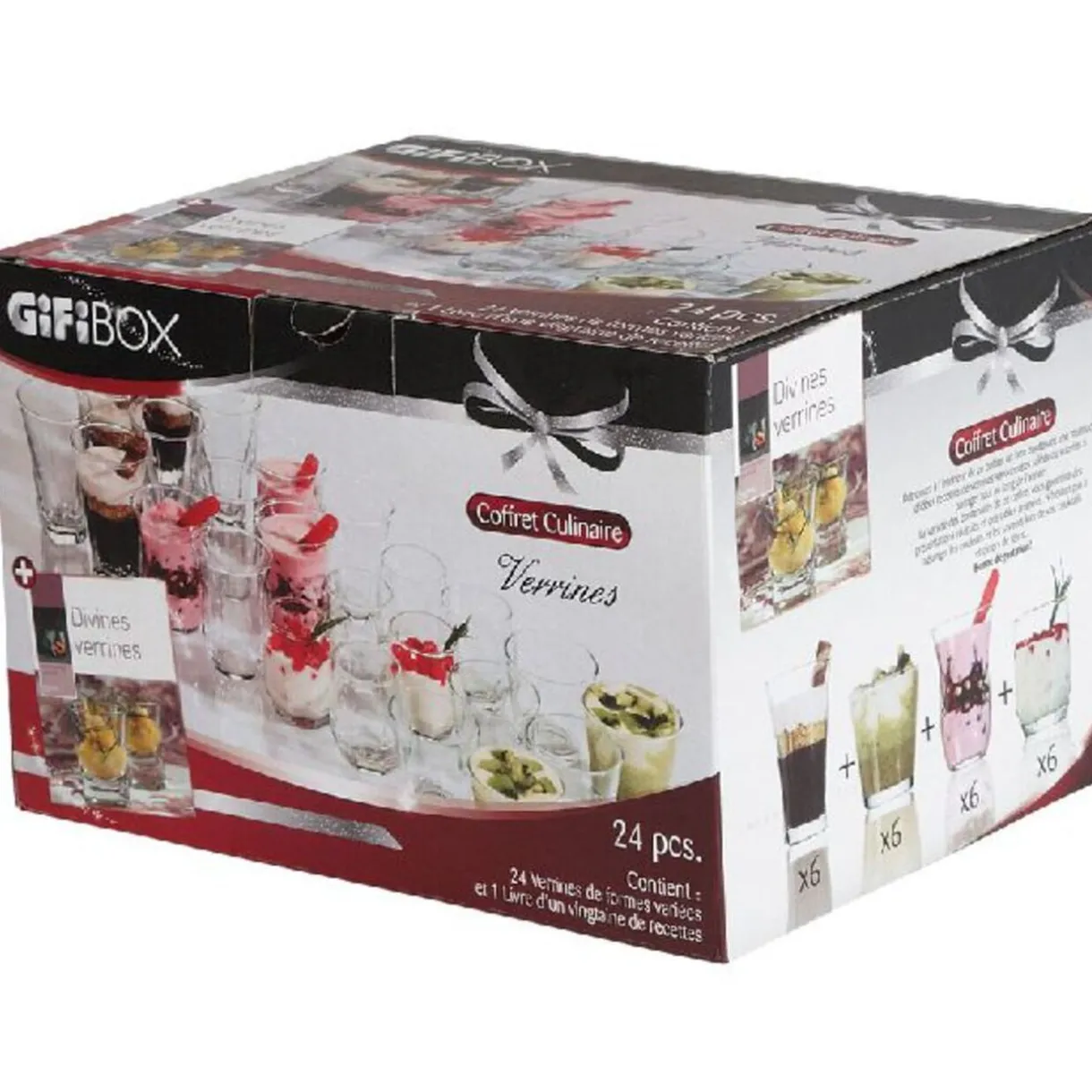 Retrouvez à l’intérieur de ce coffret un livre (éditions Hachette) contenant une multitude d’idées recettes de verrines savoureuses salées ou sucrées, à partager tout au long de l’année. Le coffret comprend également 24 verrines de formes variées (h. 5.5 cm, 6 cm, 7.5 cm et 9 cm) pour des présentations réussies et des tables animées. N’hésitez pas à mélanger les couleurs et les saveurs lors de vos cocktails et diners de fête. Bonne dégustation !Les GiFi Box sont des coffrets cadeaux sur des thématiques variées: culinaire mais aussi l’art de recevoir, le bien-être, les loisirs… Découvrez vite toute la gamme des .