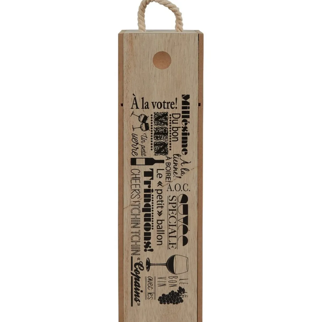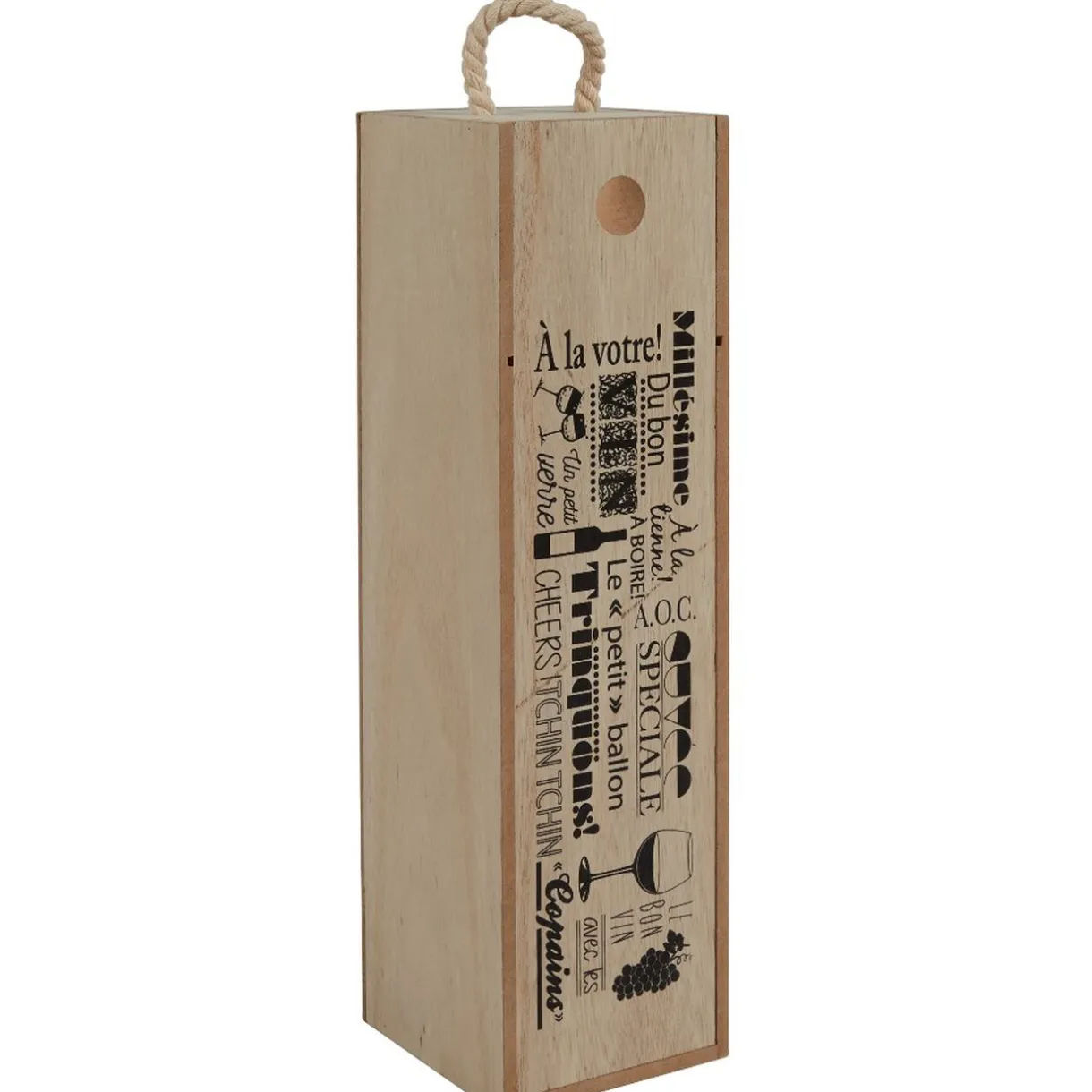 Caisse en bois pour bouteille de vin de couleur naturel et blanc avec inscription en noir.
