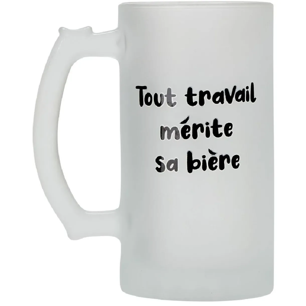 Chope de bière en verre blanc transparent avec inscription humoristique en lettres noires : « Tout travail mérite sa bière » ou « Keep calm and drink beer ».