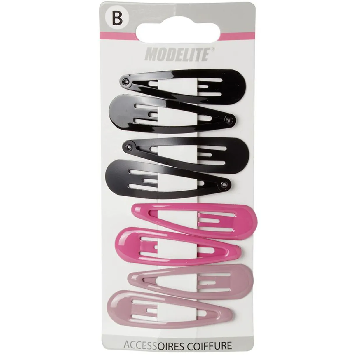 Lot de 8 barrettes clic clac en métal uni. 4 noirs, 2 roses fluos et 2 rose clair.