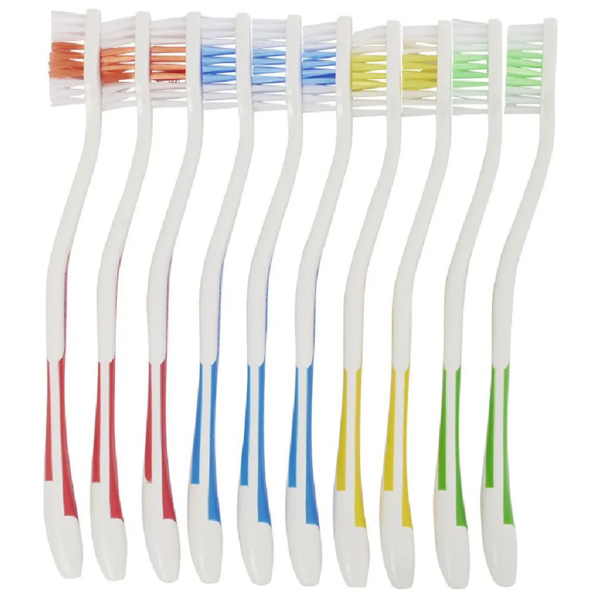 Lot de 10 brosses à dents dont 3 rouges, 3 bleues, 2 jaunes et 2 vertes.