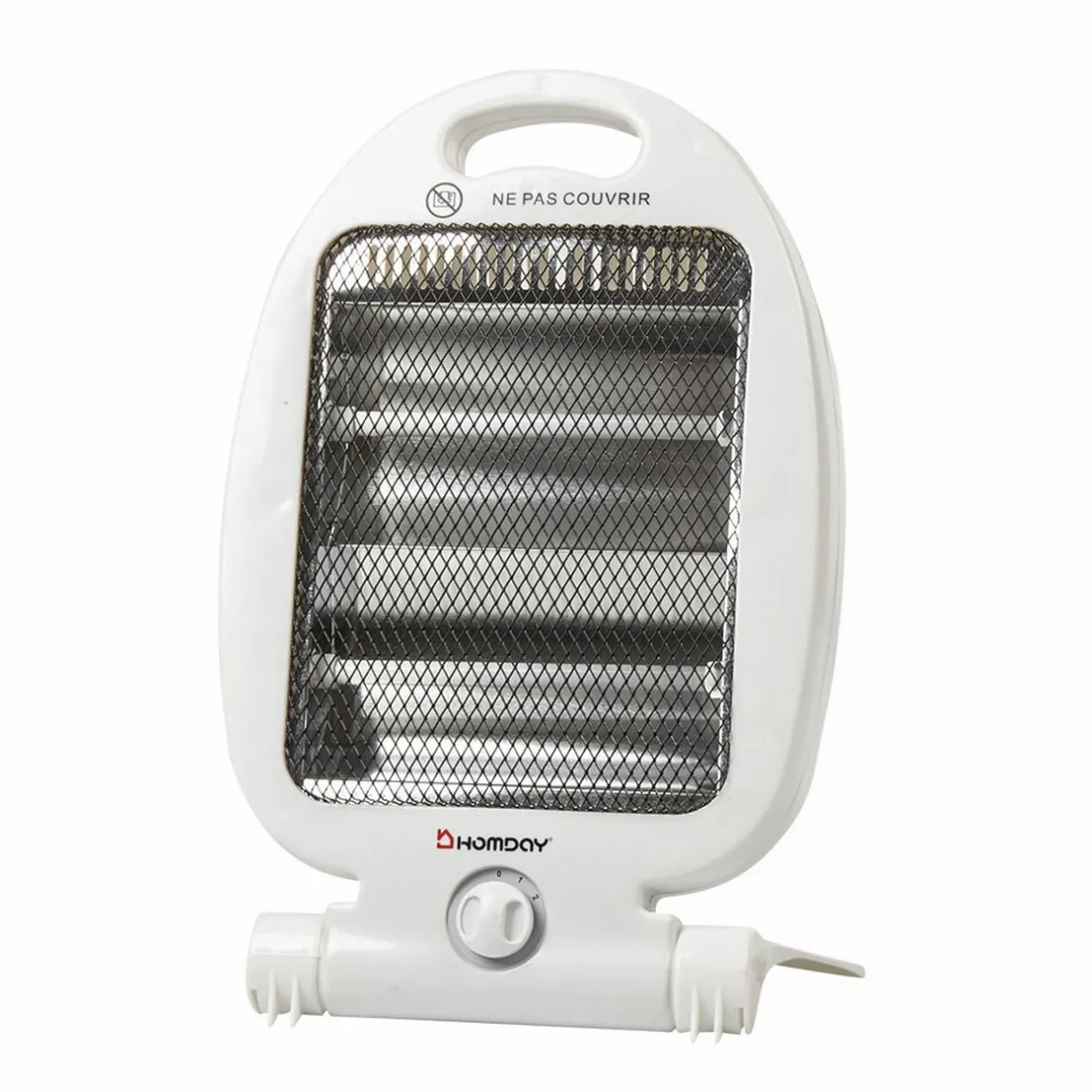 Chauffage d’appoint Homday, 2 allures de chauffe : 700 et 800 W, technologie quartz, fonctionne sur secteur. Température réglable, poignée de transport et système antibascule. Dim. 24x19xh.38,5 cm, plastique. Garantie 2 ans..