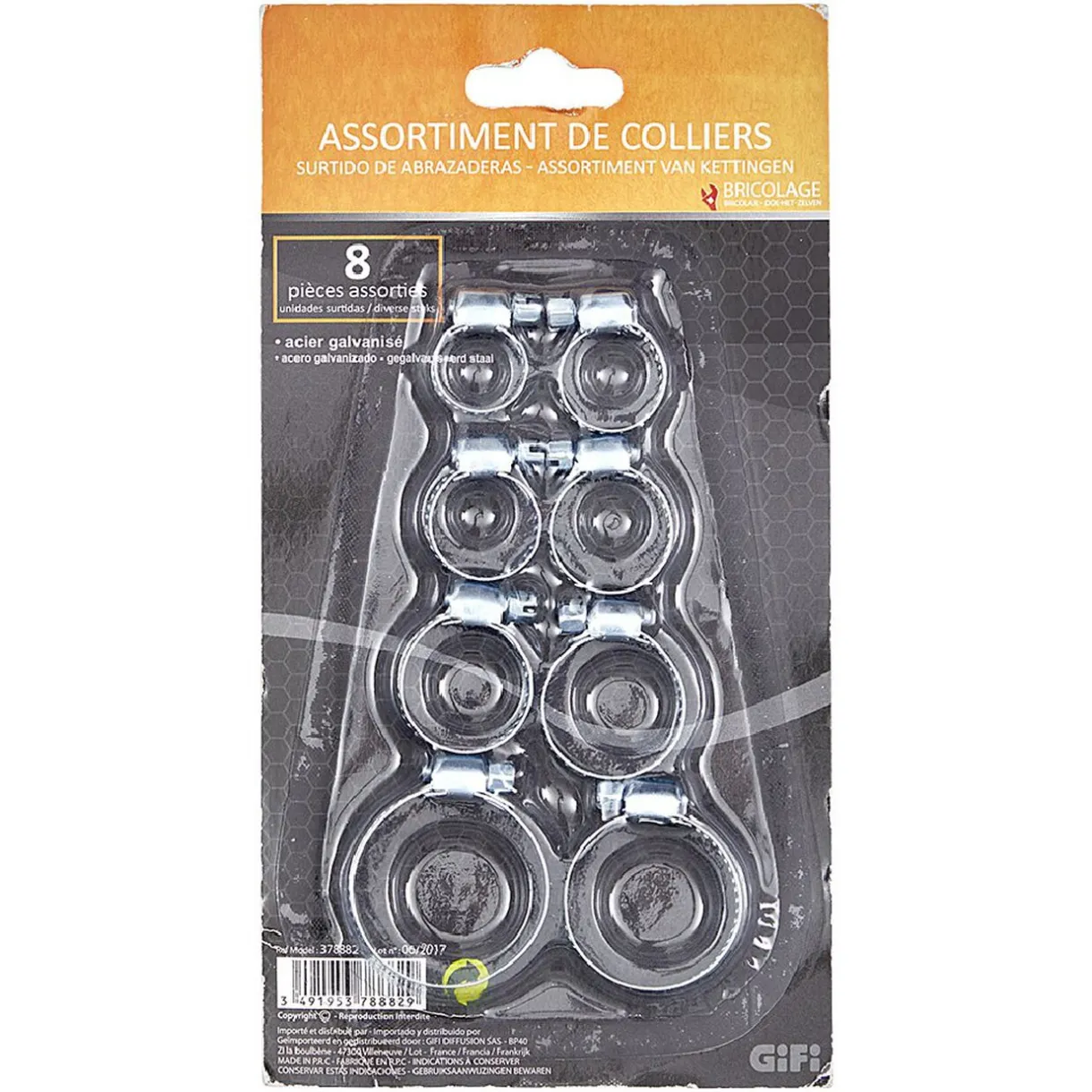 Assortiment de 8 colliers de serrage en acier galvanisé.