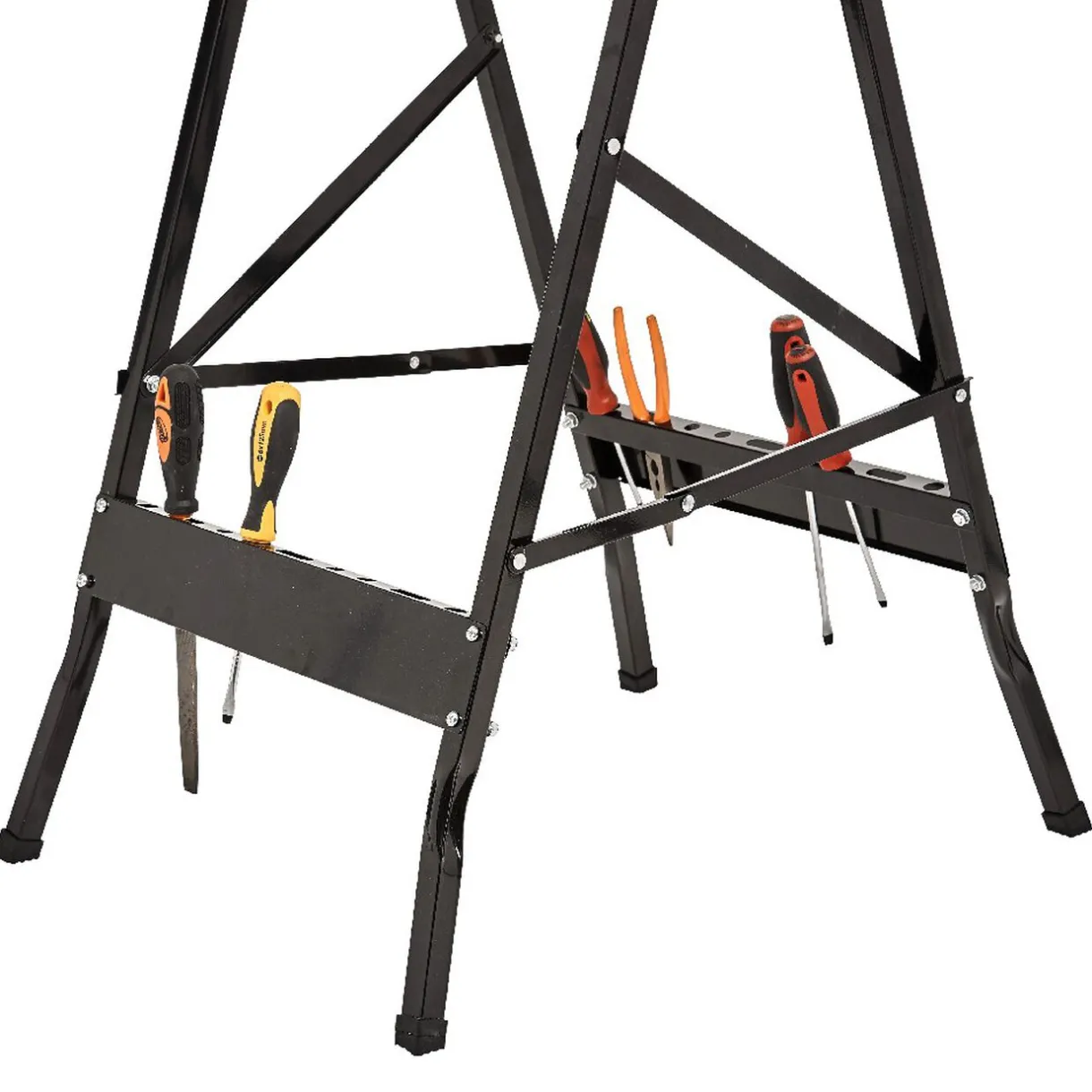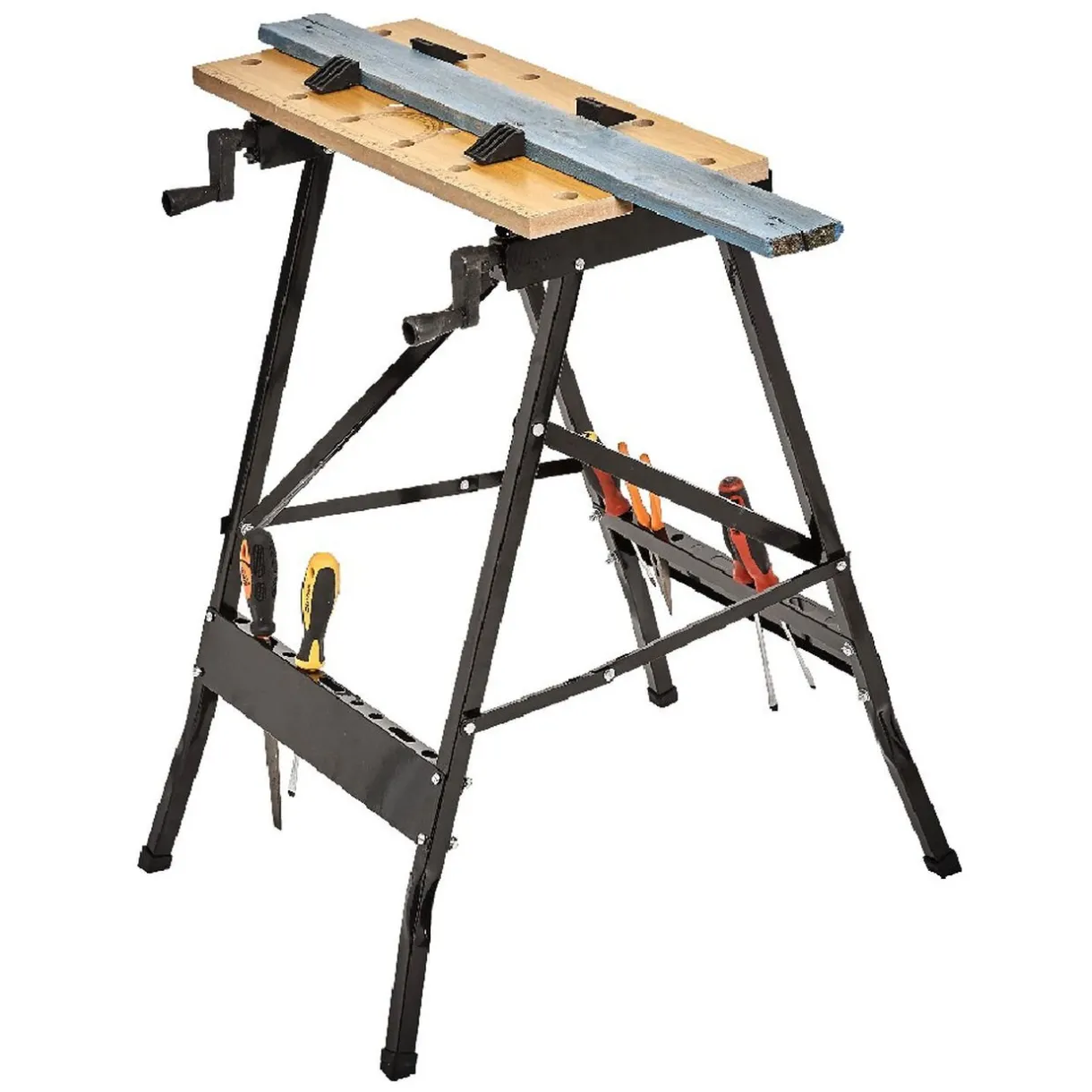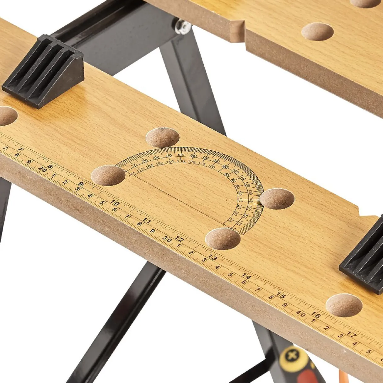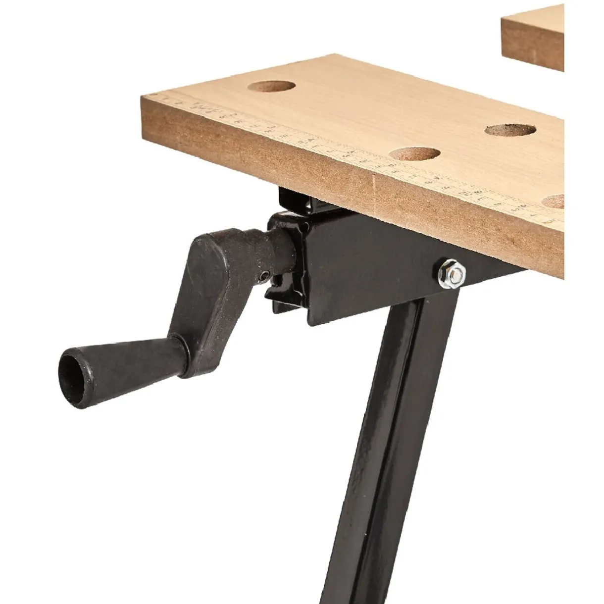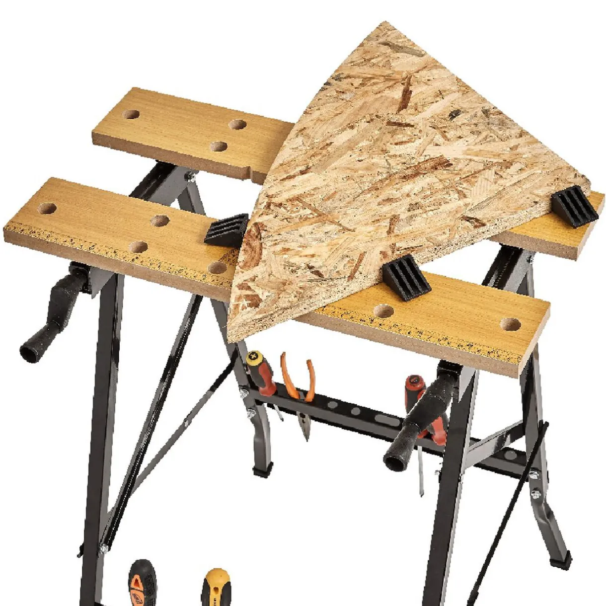 Cet établi de serrage pliant offre une surface de travail très pratique avec guides gradués et mors multi-positions.