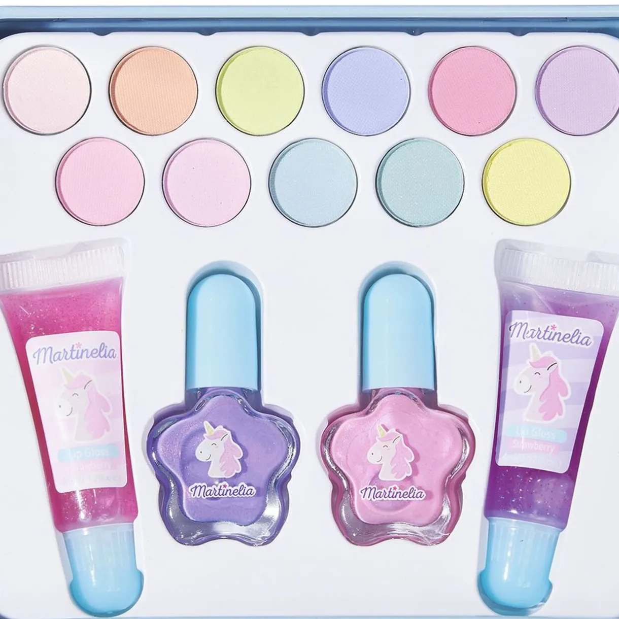 Mallette à maquillage Martinelia Little Unicorn en métal composée de 11 ombres à paupières, 2 brillants à lèvres et 2 vernis à ongles.
