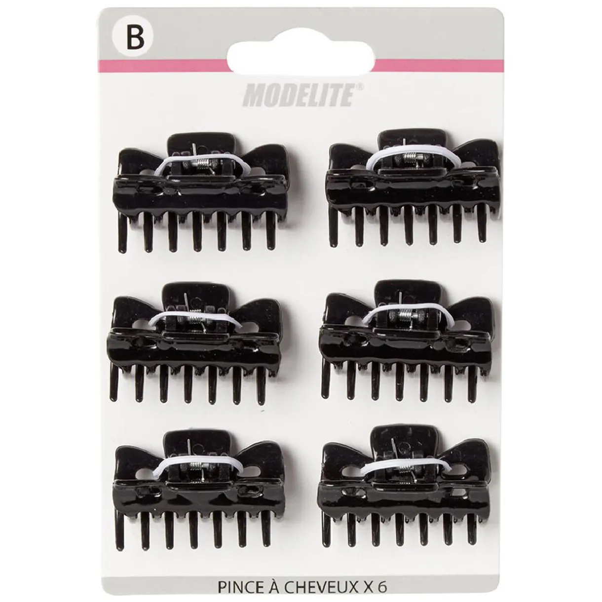 Lot de 6 petites pinces crocodiles en plastique uni noir brillant. Longueur : 4 cm