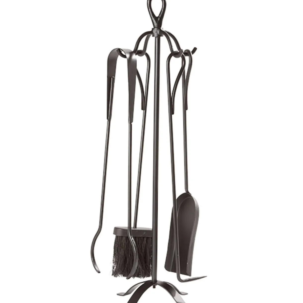 Serviteur de cheminée, h. 69 cm, métal, comprend : 1 pelle à cendres, 1 balayette, 1 tisonnier et 1 paire de pinces.