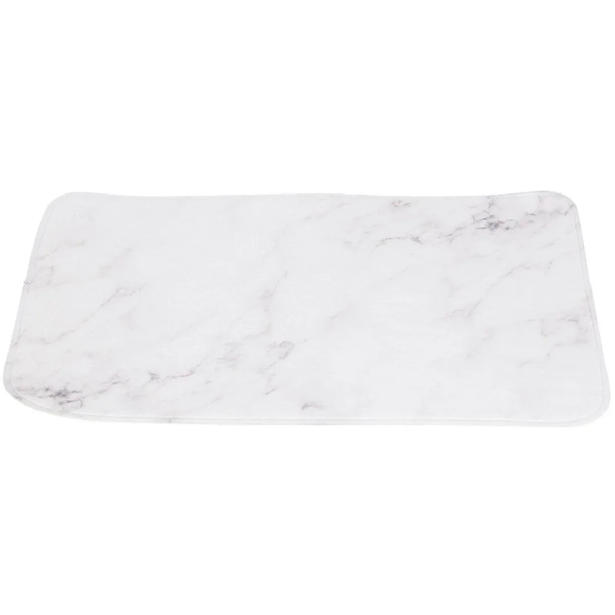 Le tapis de salle de bain existe en 4 différents modèles, selon disponibilité : blanc, marbré, zig-zag noir et blanc ou « good things take time ».