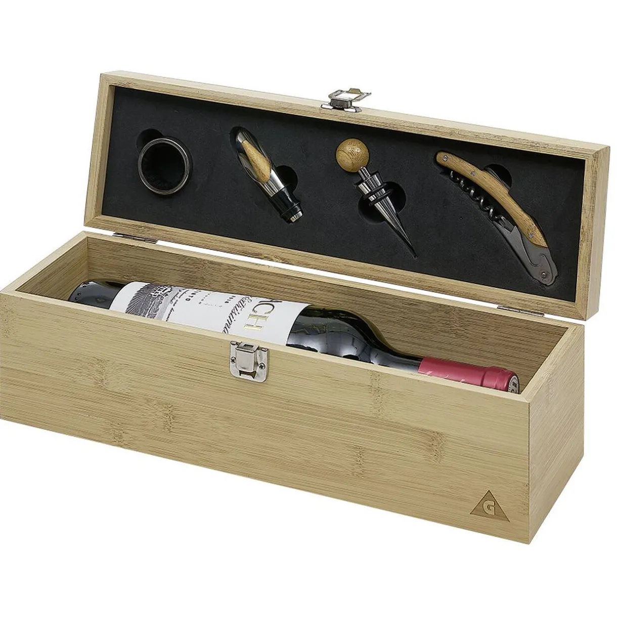 Parfait pour offrir une bouteille de vin, ce bel écrin en bois comprend sous le couvercle 1 tire-bouchon, 1 bec verseur, 1 bouchon et 1 stop goutte.