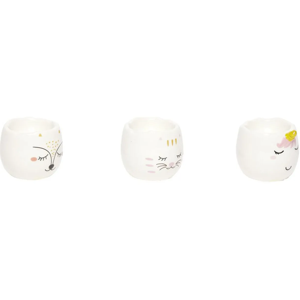 Coffret composé de 3 coquetiers avec rebord en relief design tête de chat, renard et licorne.