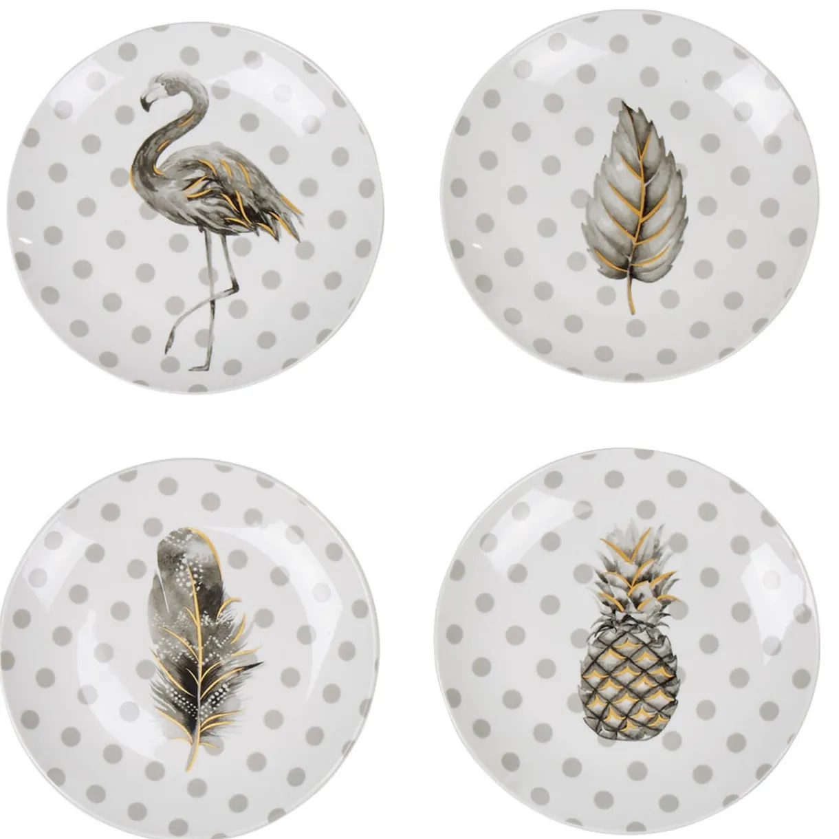 Coffret de 4 assiettes à dessert à fond blanc motifs pois et 4 designs différents de couleur gris et doré :