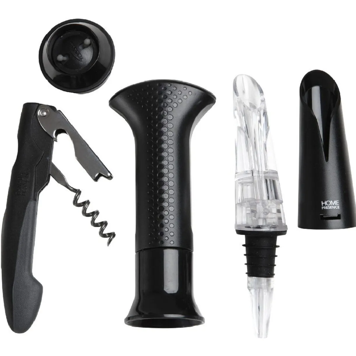 Coffret oenologie 4 pièces comprenant 1 pompe vide-air, 1 bouchon, 1 aérateur et 1 tire bouchon.