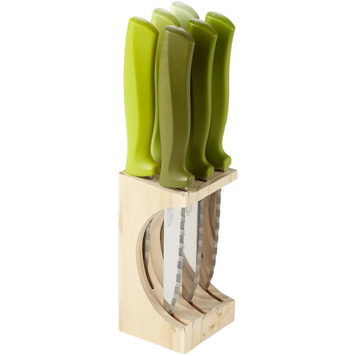 Bloc en bois contenant 6 couteaux à steak colorés en inox. Disponibilité des coloris selon stock en magasin.