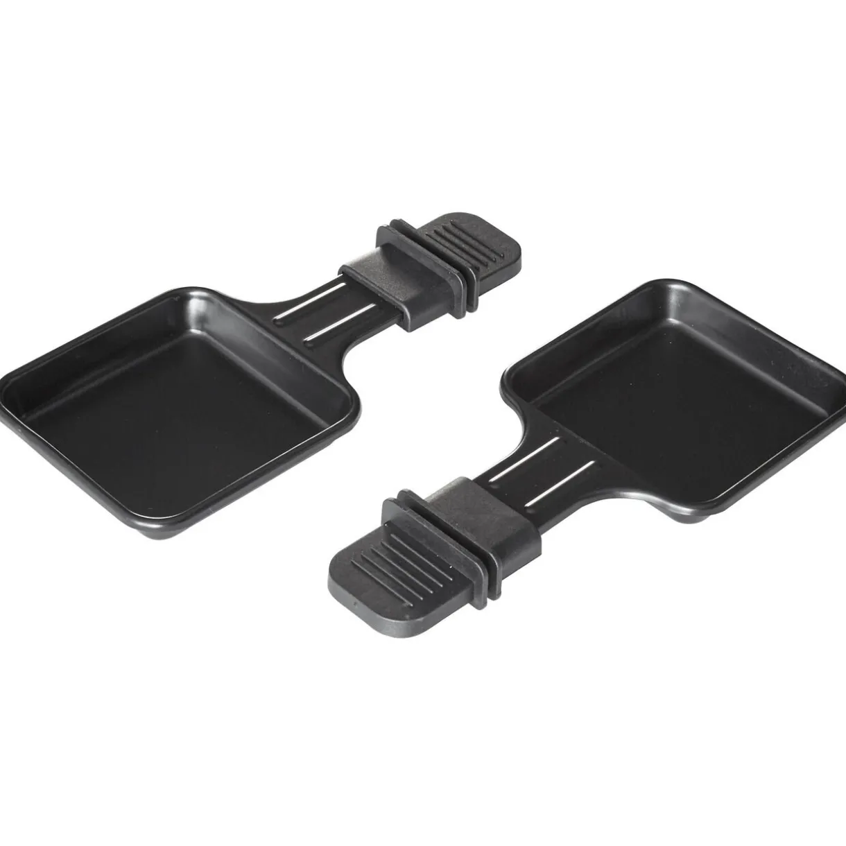 Set de deux coupelles à raclette de forme carrée en aluminium avec revêtement antiadhésif.