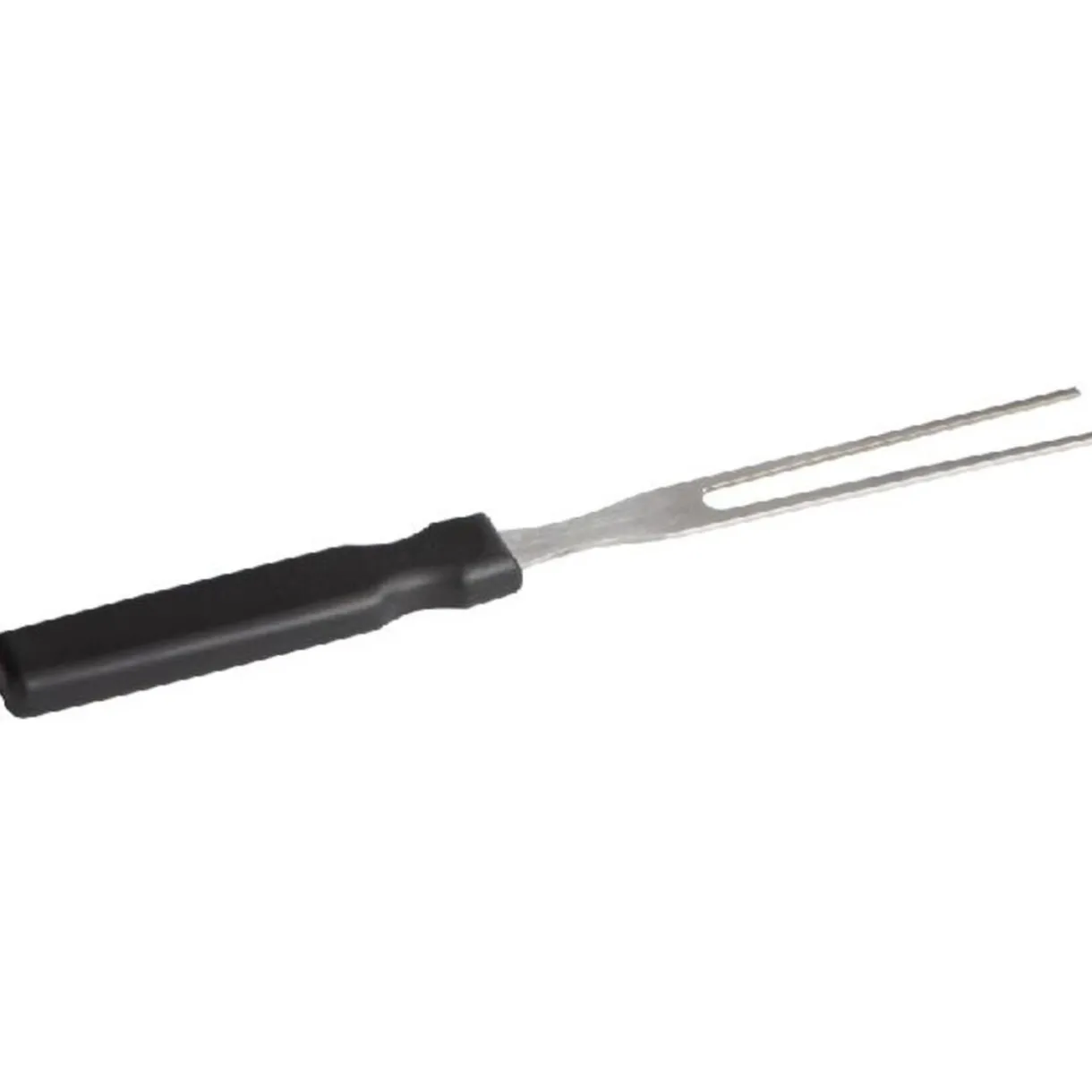 Couteau avec guide permettant de découper le pain, la viande ou les légumes. Vous pouvez régler l’épaisseur de votre tranche en tournant la molette. Il comprend une fourchette à viande. L. 32,5 cm.