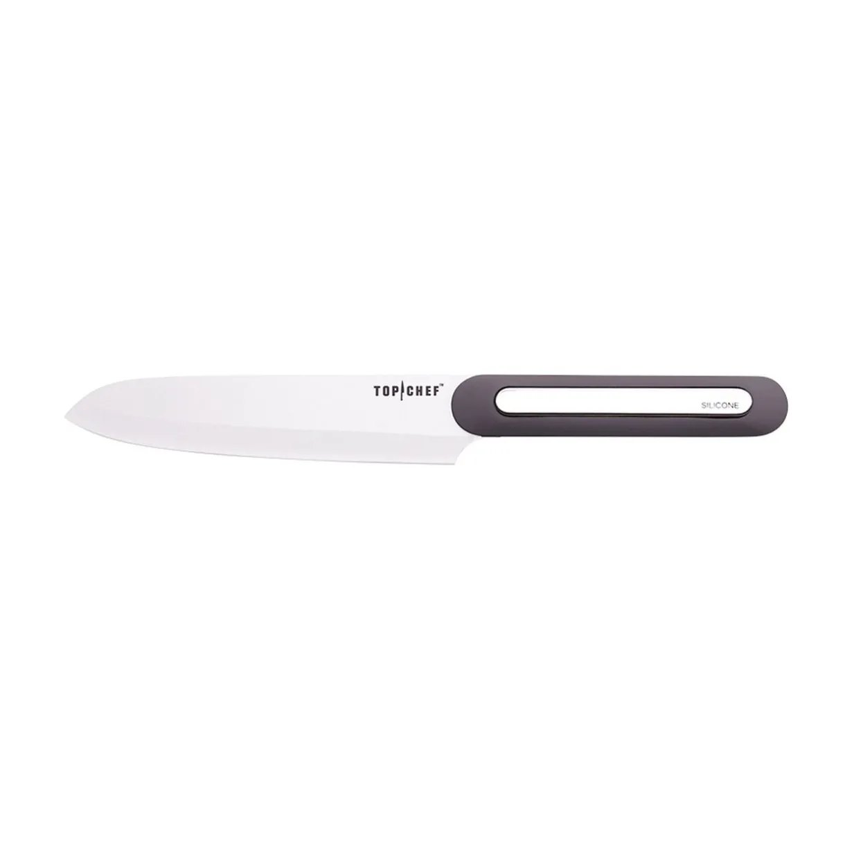 Couteau santuko avec lame en céramique et manche en silicone. Polyvalent, il permet de ciseler, trancher, émincer fruits et légumes comme hâcher la viandes et les poissons crus sans effort.