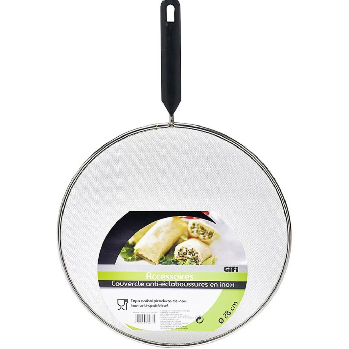 Idéal pour éviter les salissures, ce couvercle anti éclaboussures en inox d’un diamètre de 28 cm est équipé d’une poignée en plastique noir.