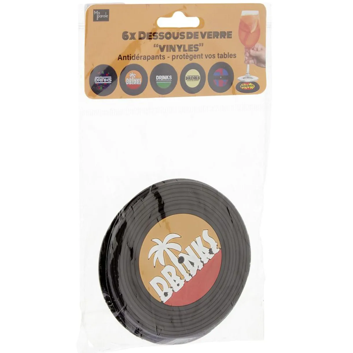 Lot de 6 dessous de verre style vinyle avec inscription au centre, idéals pour ne pas laisser de trace sur votre table.