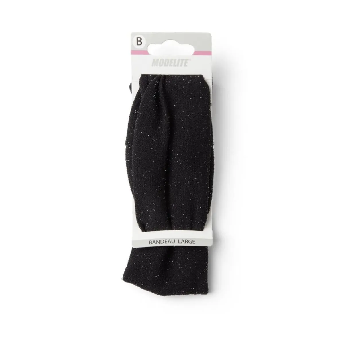 Bandeau large en maille noire à paillettes argentées, idéal pour ajouter une touche scintillante à toute tenue.