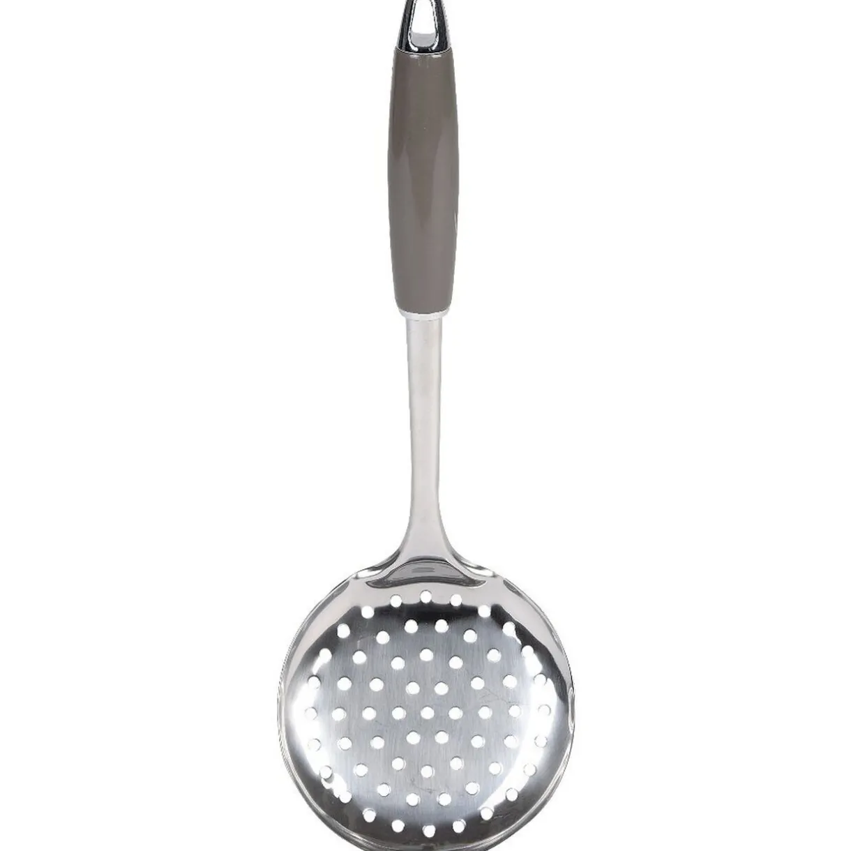 Écumoire en inox avec manche en plastique couleur taupe.