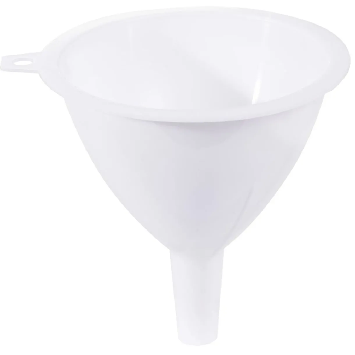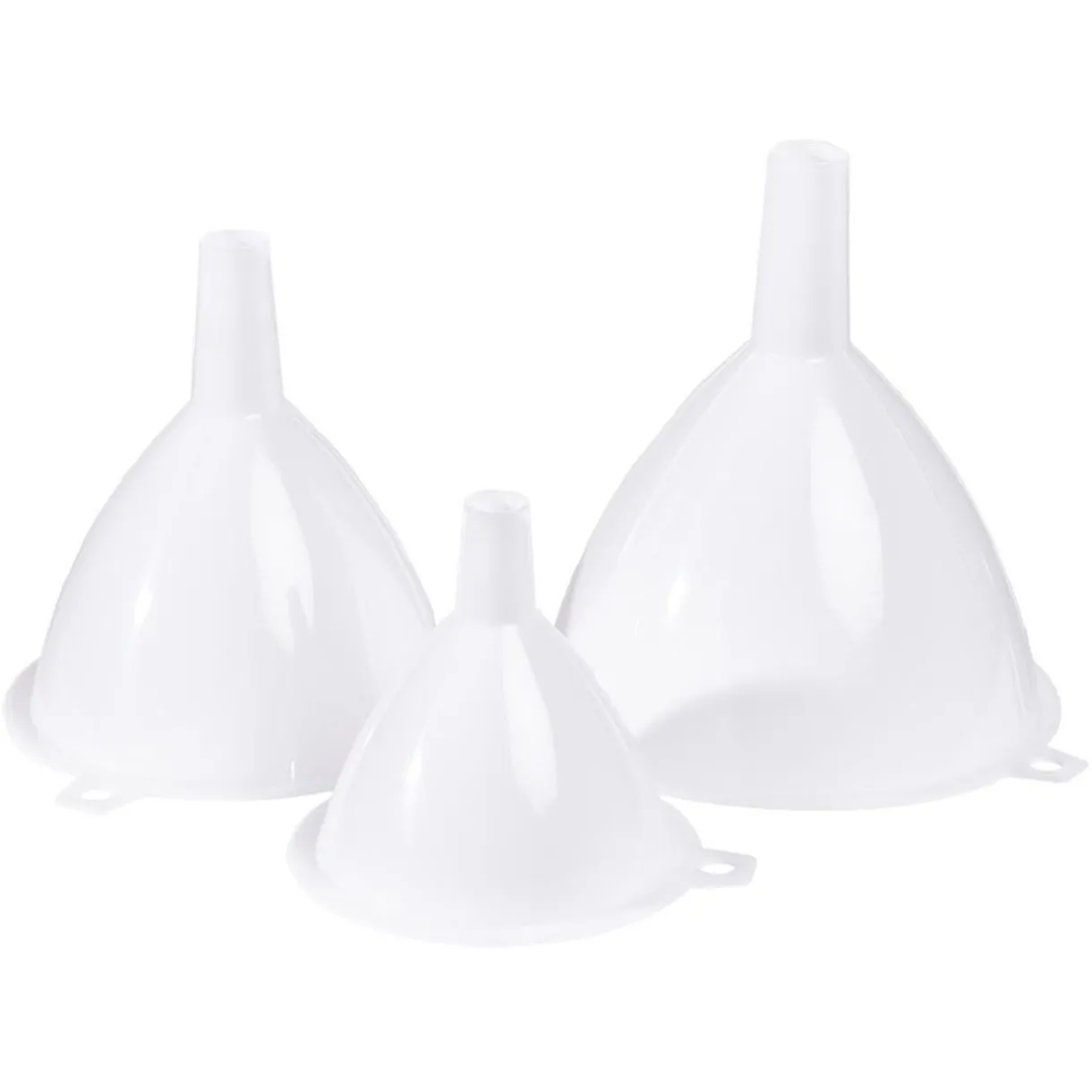 Lot de 3 entonnoirs blancs, chacun d’un diamètre différent.