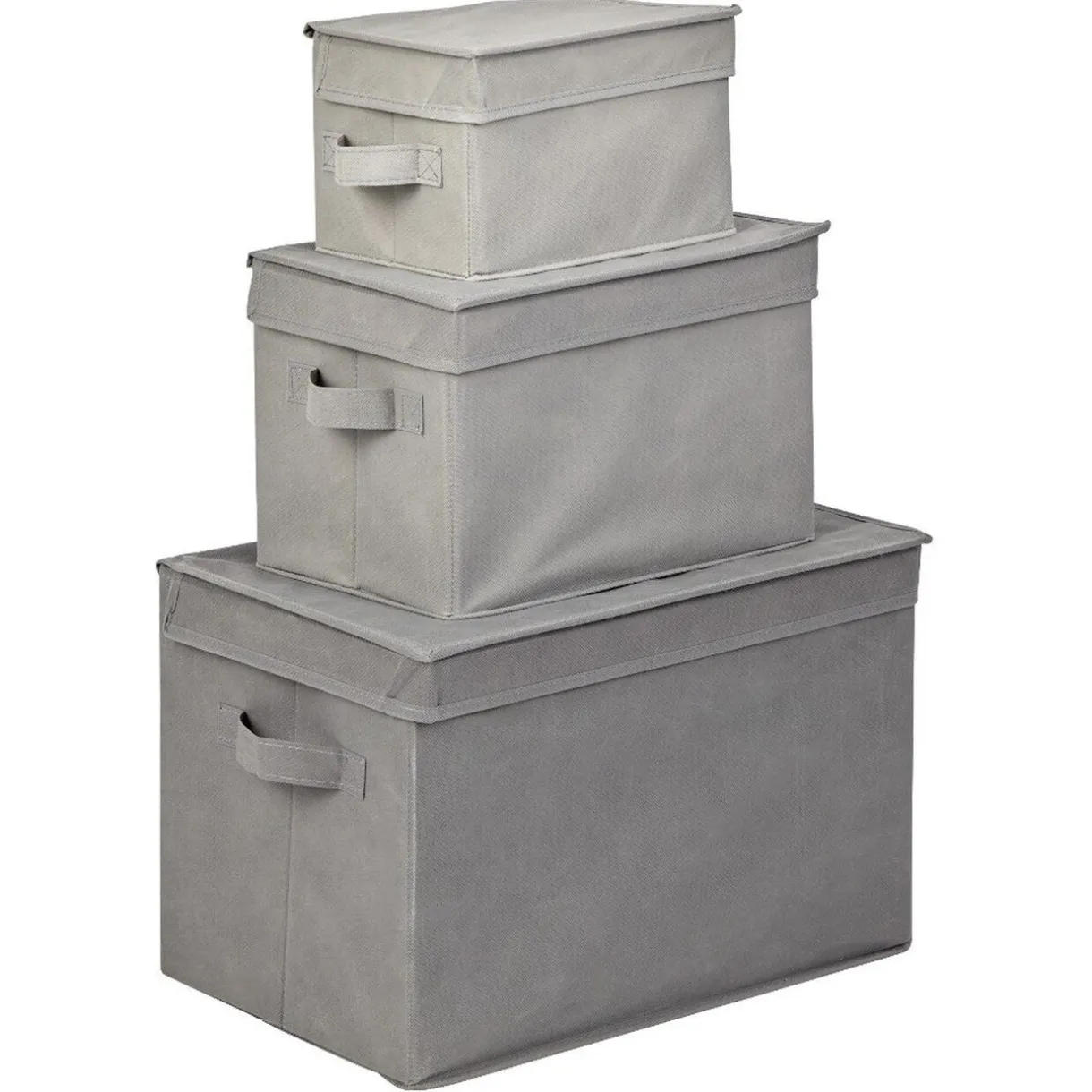Lot de 3 boîtes de rangement de couleur grise avec couvercle sur le dessus et poignée sur le devant.
